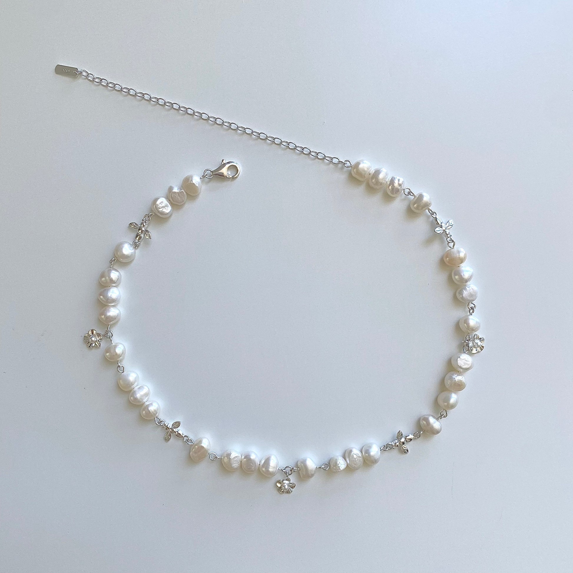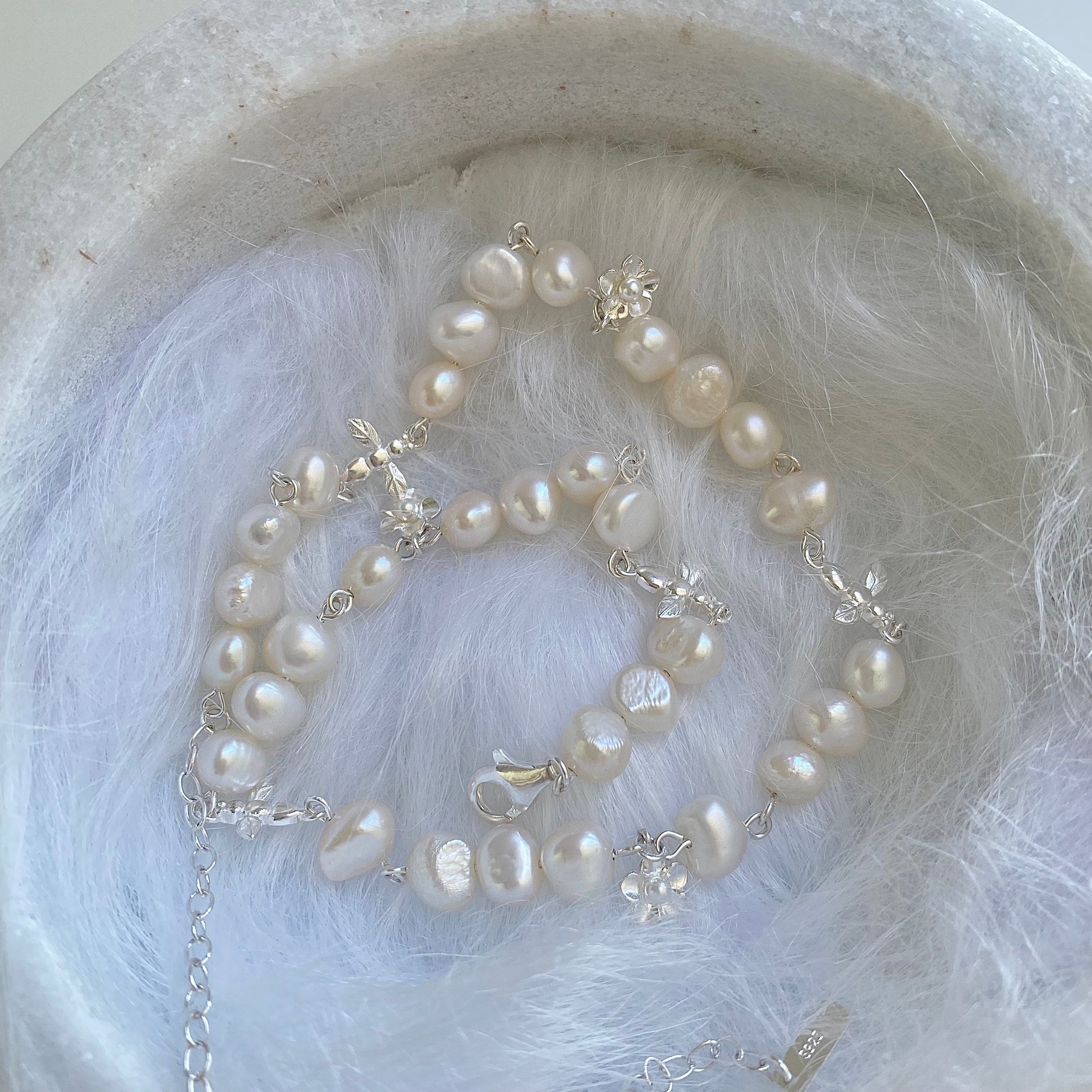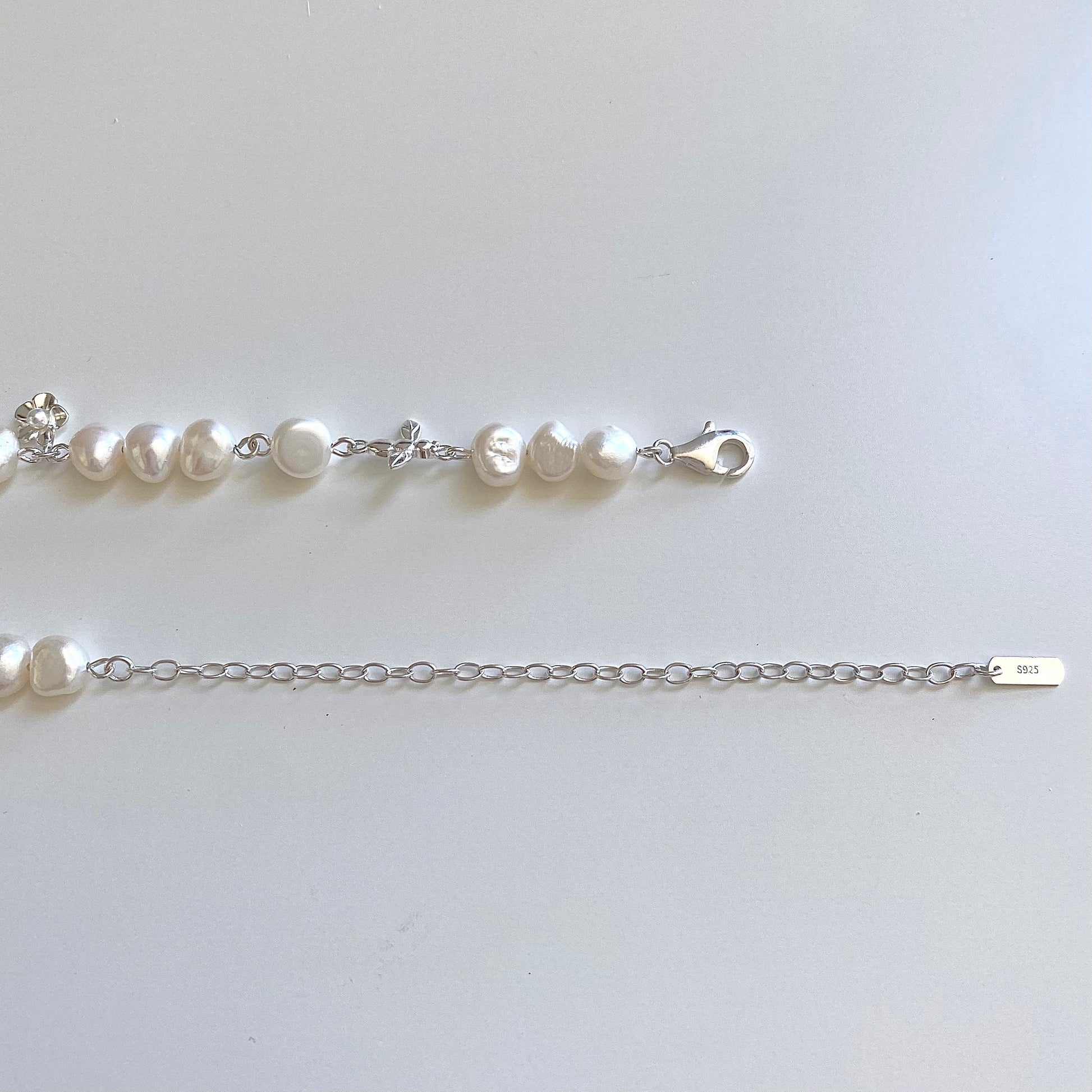 Several pearls are linked by delicate segments of pure S925 silver chain, with each chain segment adorned with a finely crafted silver flower charm, adding a touch of whimsy to the necklace's natural elegance.