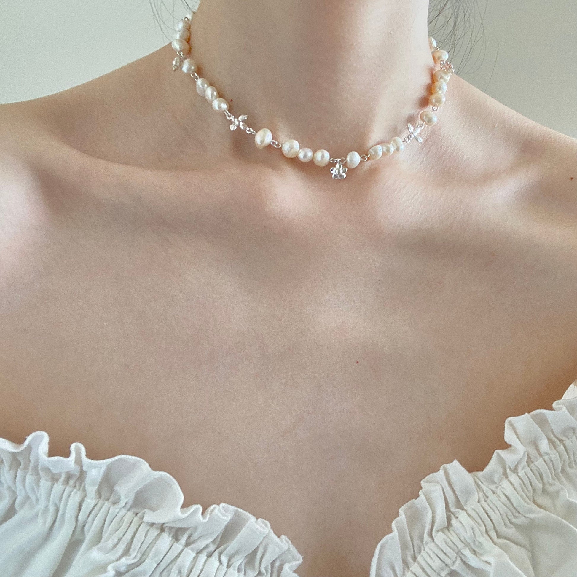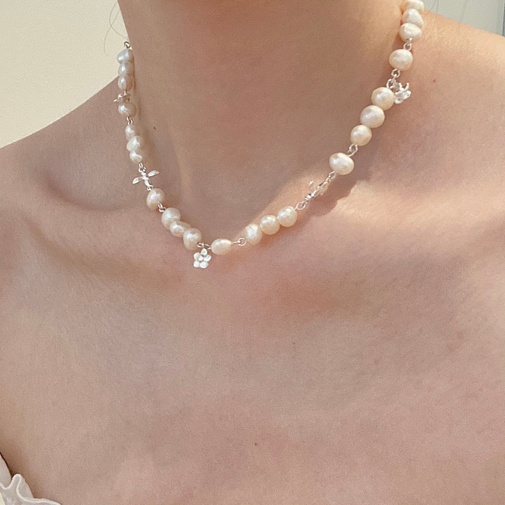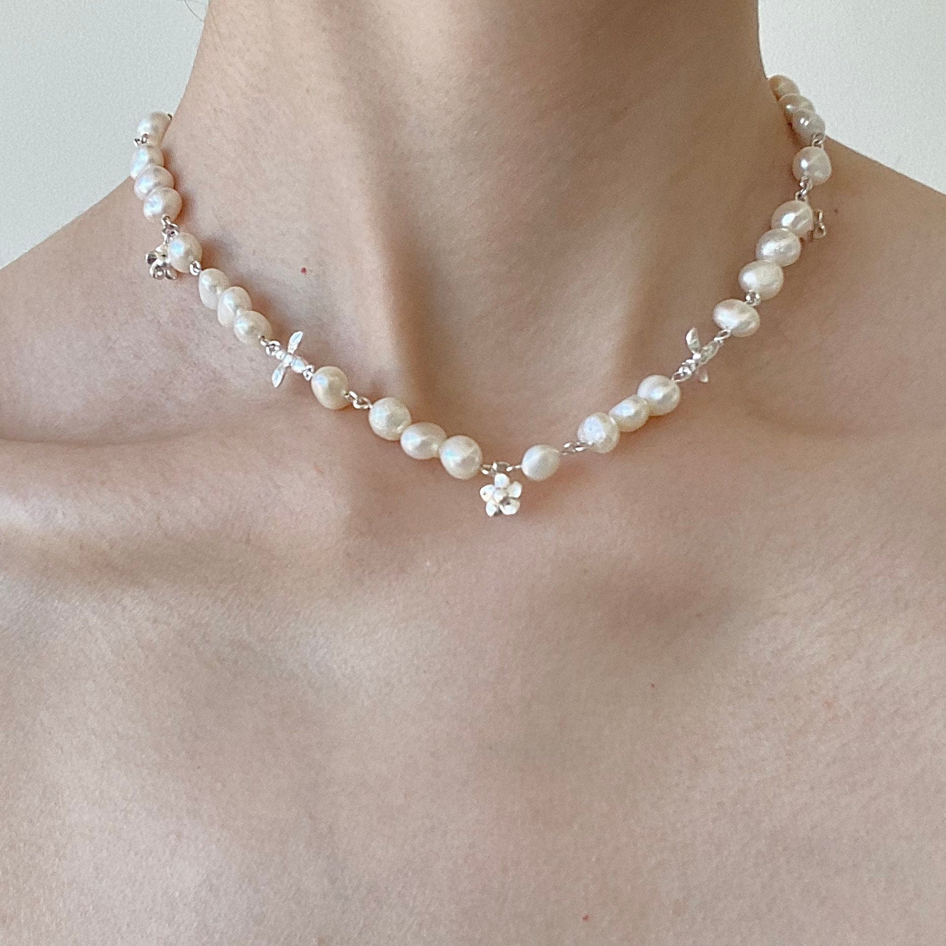 Several pearls are linked by delicate segments of pure S925 silver chain, with each chain segment adorned with a finely crafted silver flower charm, adding a touch of whimsy to the necklace's natural elegance.