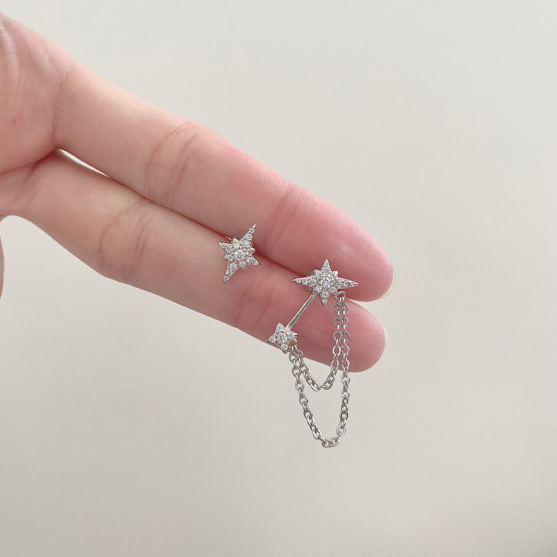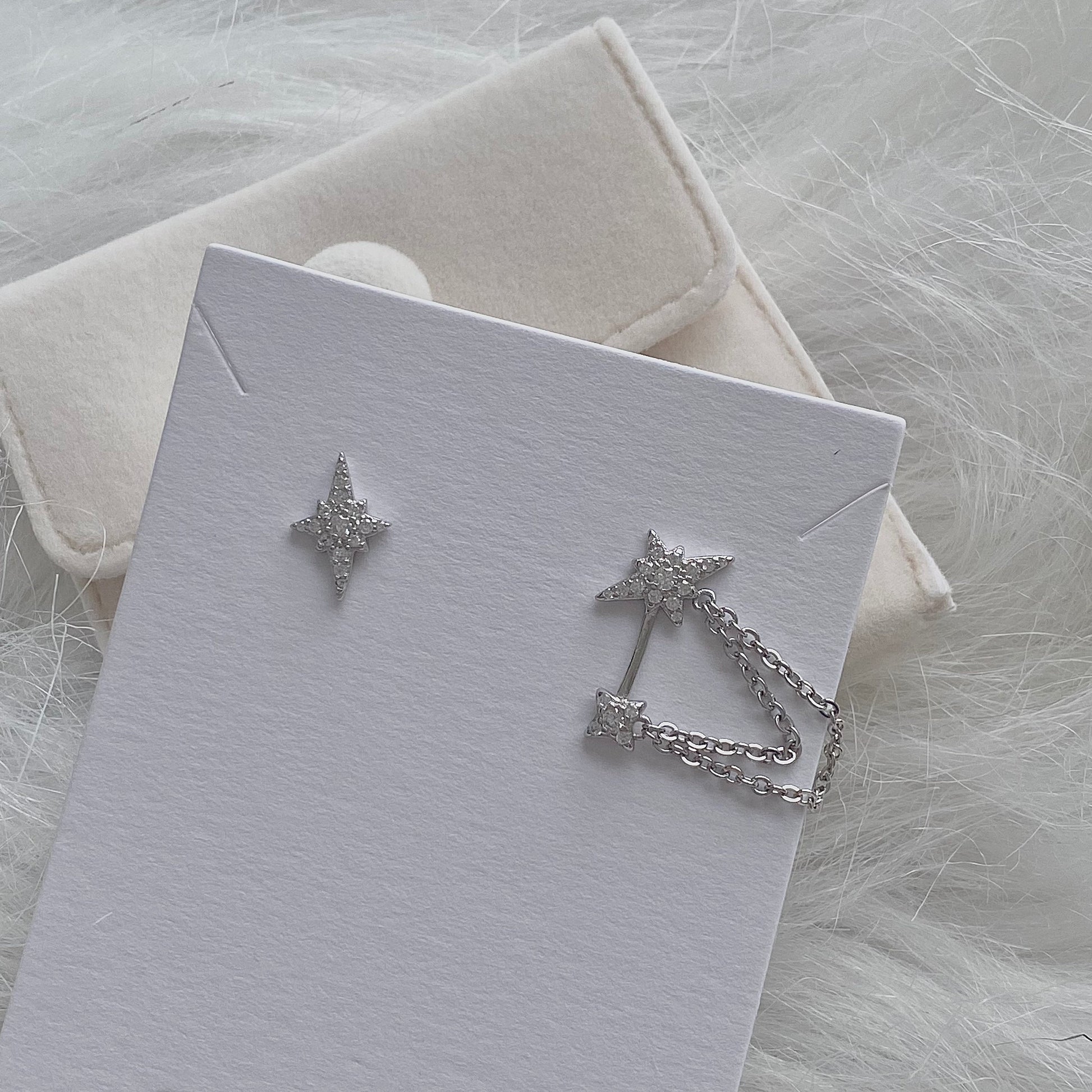 One earring features a radiant four-pointed star, its surface awash with a multitude of shimmering zirconia, evoking a night sky strewn with twinkling stars. The accompanying piece amplifies this celestial imagery. It not only boasts a matching star, but it also introduces a smaller satellite star, delicately suspended from a slender silver rod. Completing the composition, two gracefully drooping silver chains link the two stars, creating a mesmerizing cascade of silver and shine.