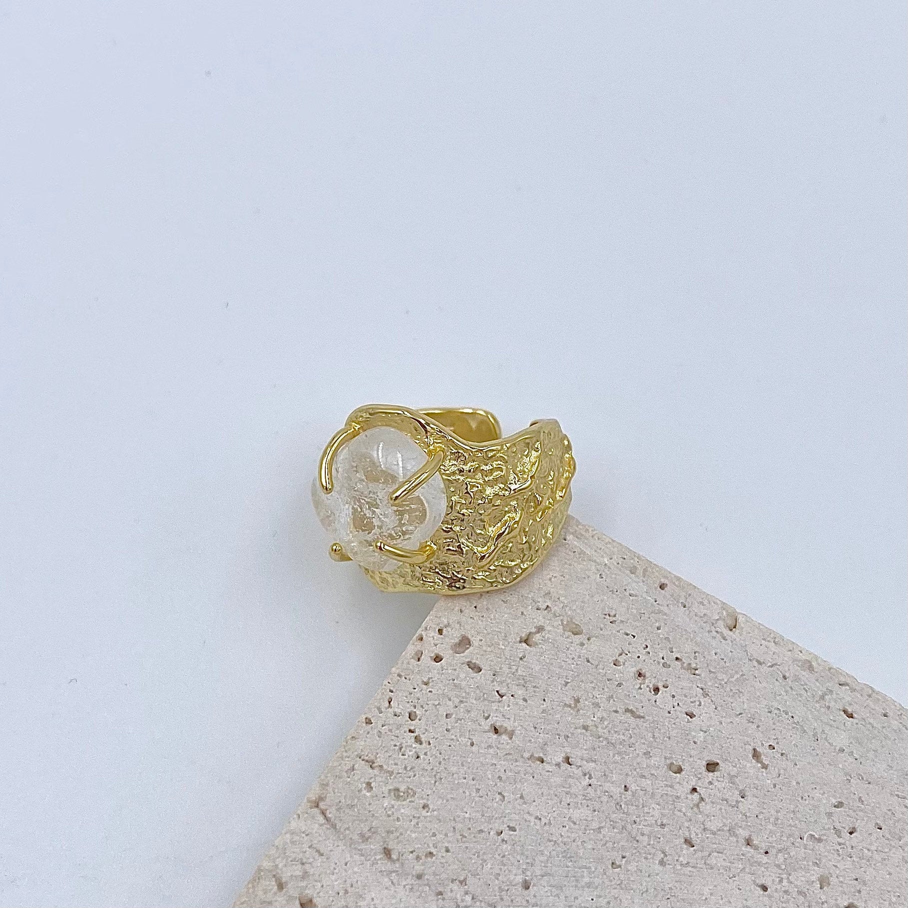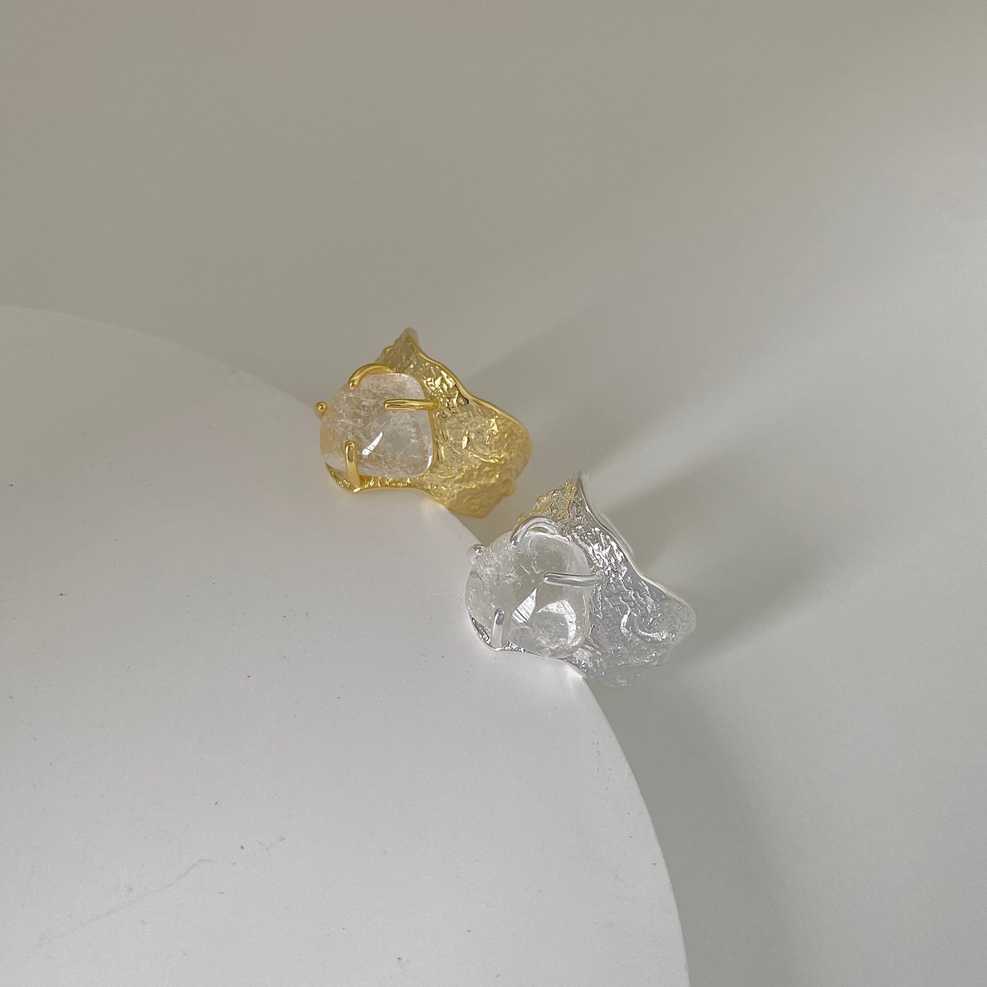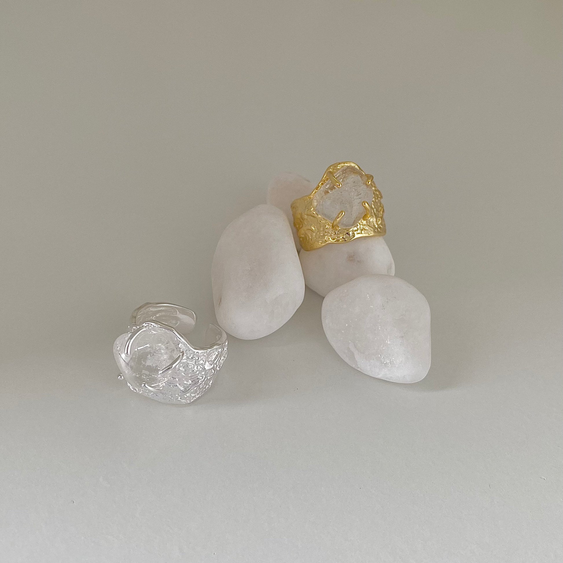 The Crystal Oasis ring features an irregularly shaped natural crystal as its centerpiece, held securely by a four-prong setting. The ring itself is remarkably wide, with an irregular texture adorning its surface, which gives each piece a unique character. The open design offers adjustability, with a base size of US 6, or 52mm.