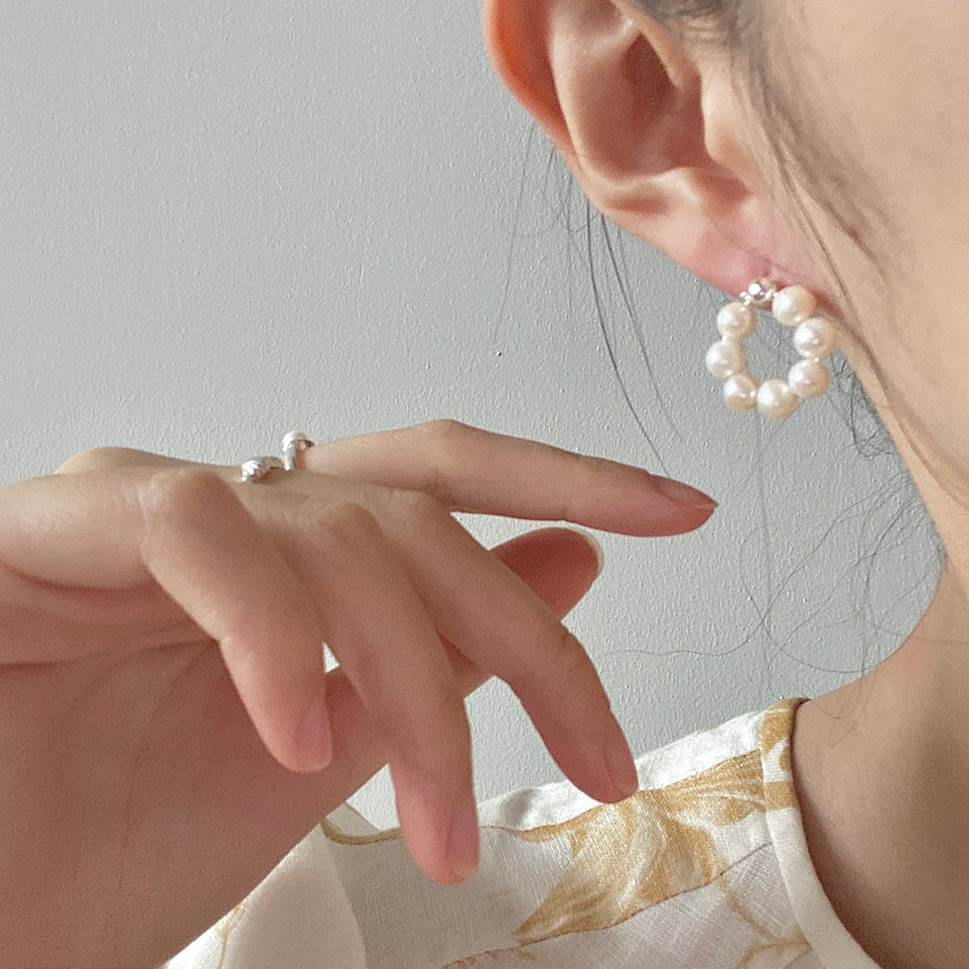 Our Pearl Halo Silver Stud Earrings are made from S925 sterling silver, part of our silver earrings collection. Acclaimed for its longevity and hypoallergenic qualities, sterling silver makes it suitable for sensitive skin. The front view of these dainty earrings reveals a circular arrangement of seven natural freshwater pearls, creating a halo effect. A single silver bead connects the pearl halo to the earring post, providing a beautiful contrast and a minimalist earrings design.