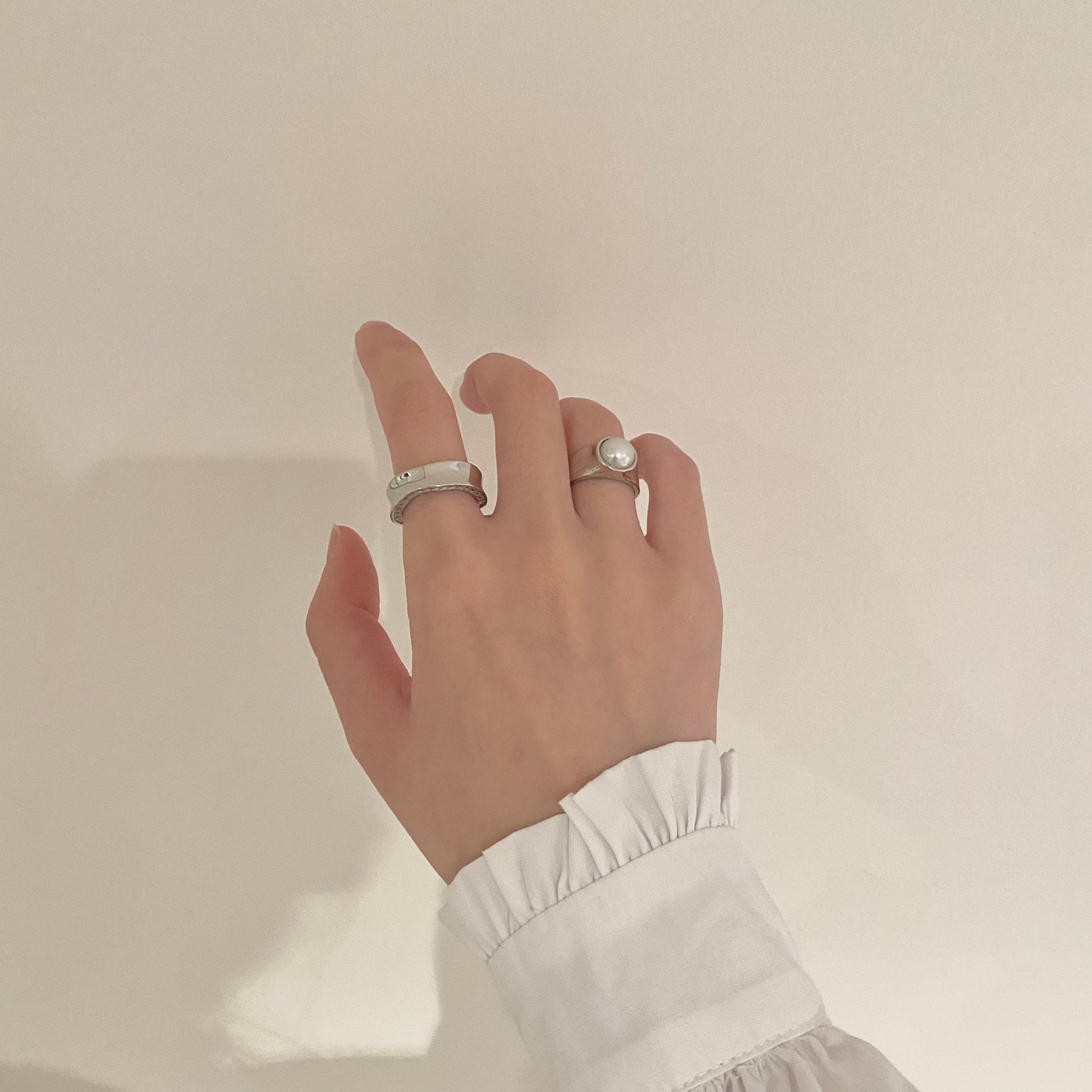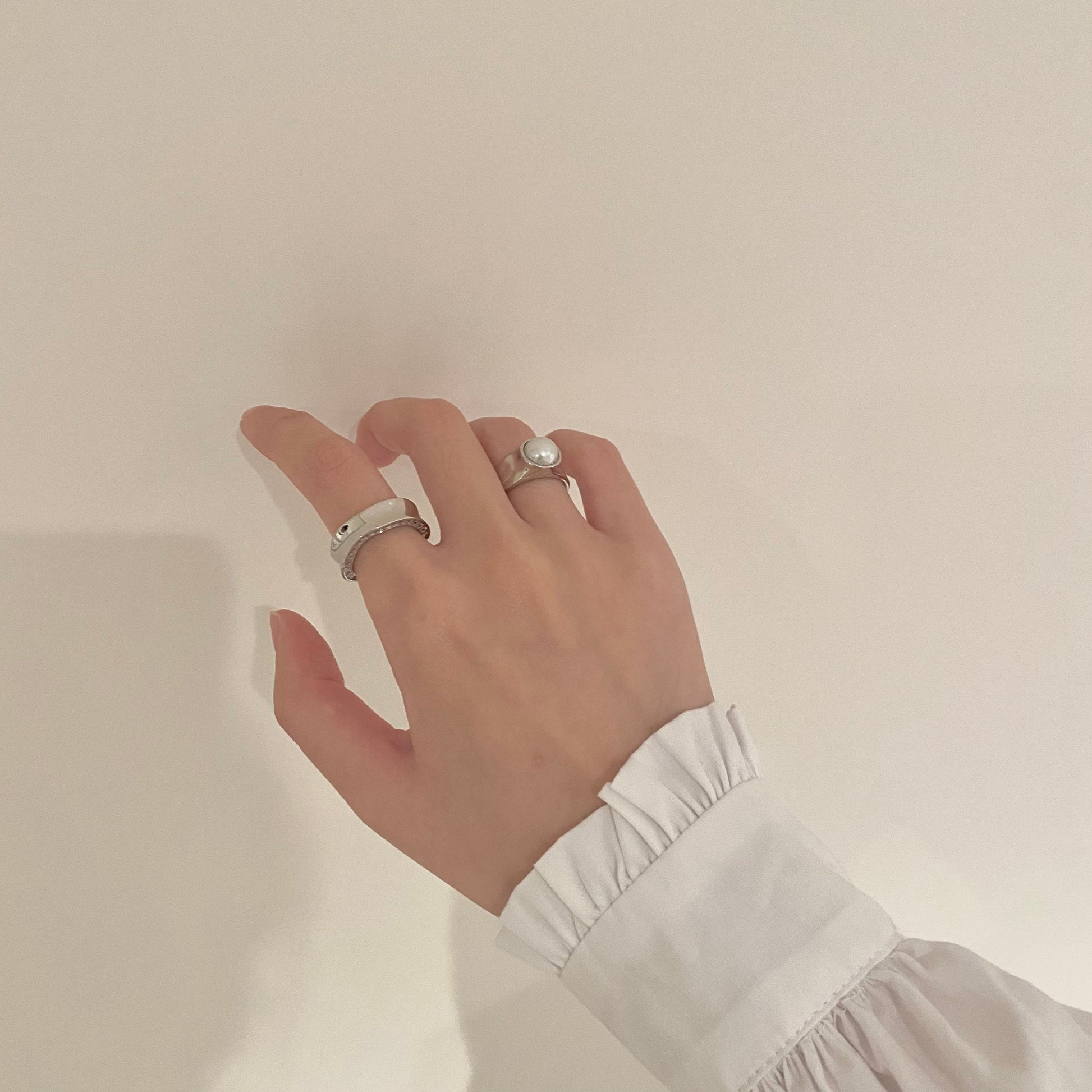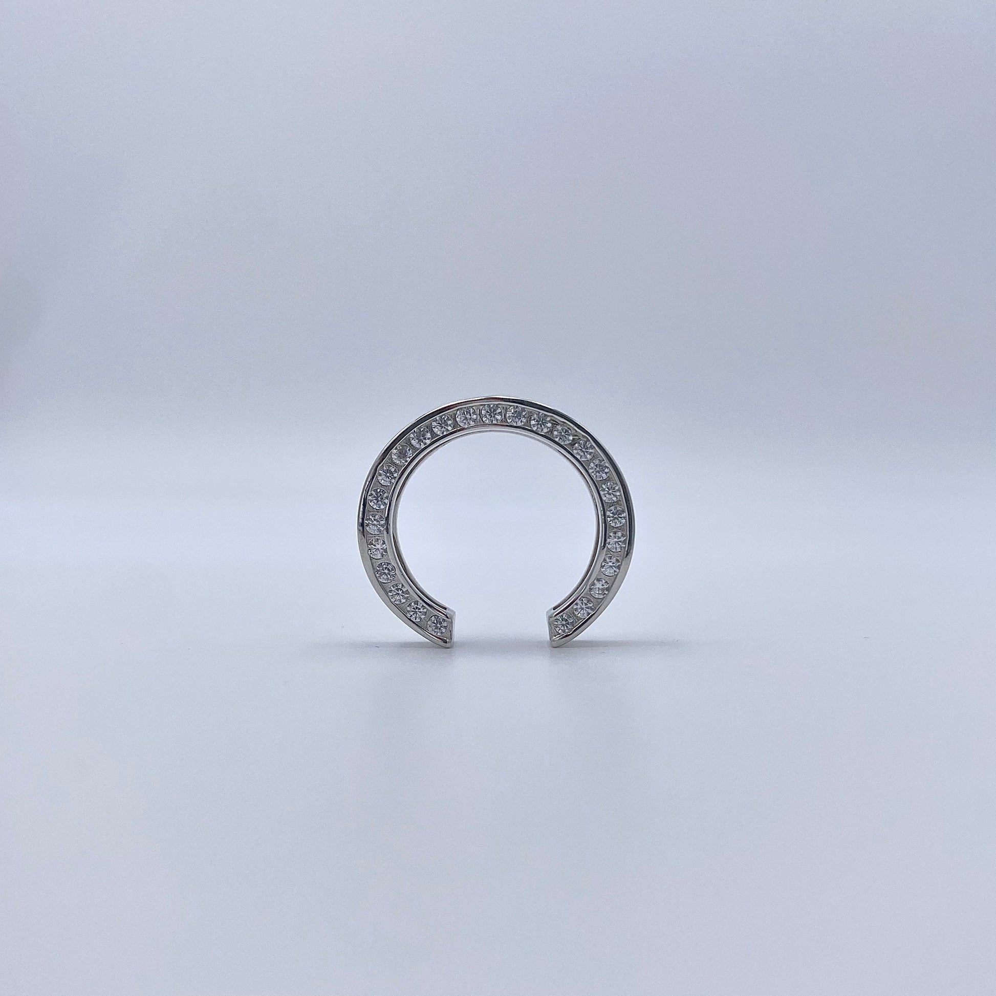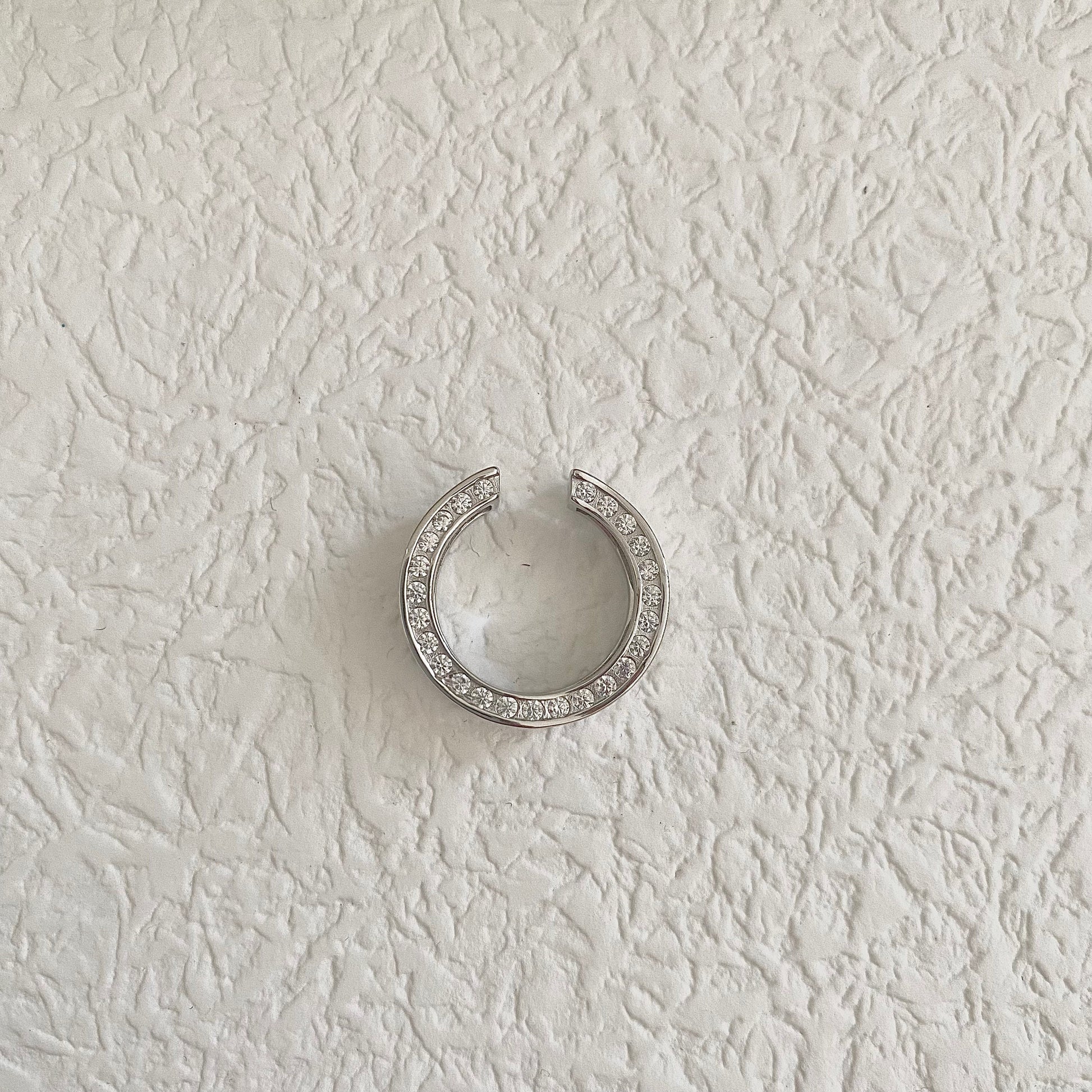 The ring is 5.6mm wide and is adorned with a circle of high-quality white Cubic zirconia on its side, offering an unexpected sparkle with every movement. The overall design is simple, yet distinctive enough to showcase your personality. The ring is a size 6.5, with an open design that allows for slight adjustments.