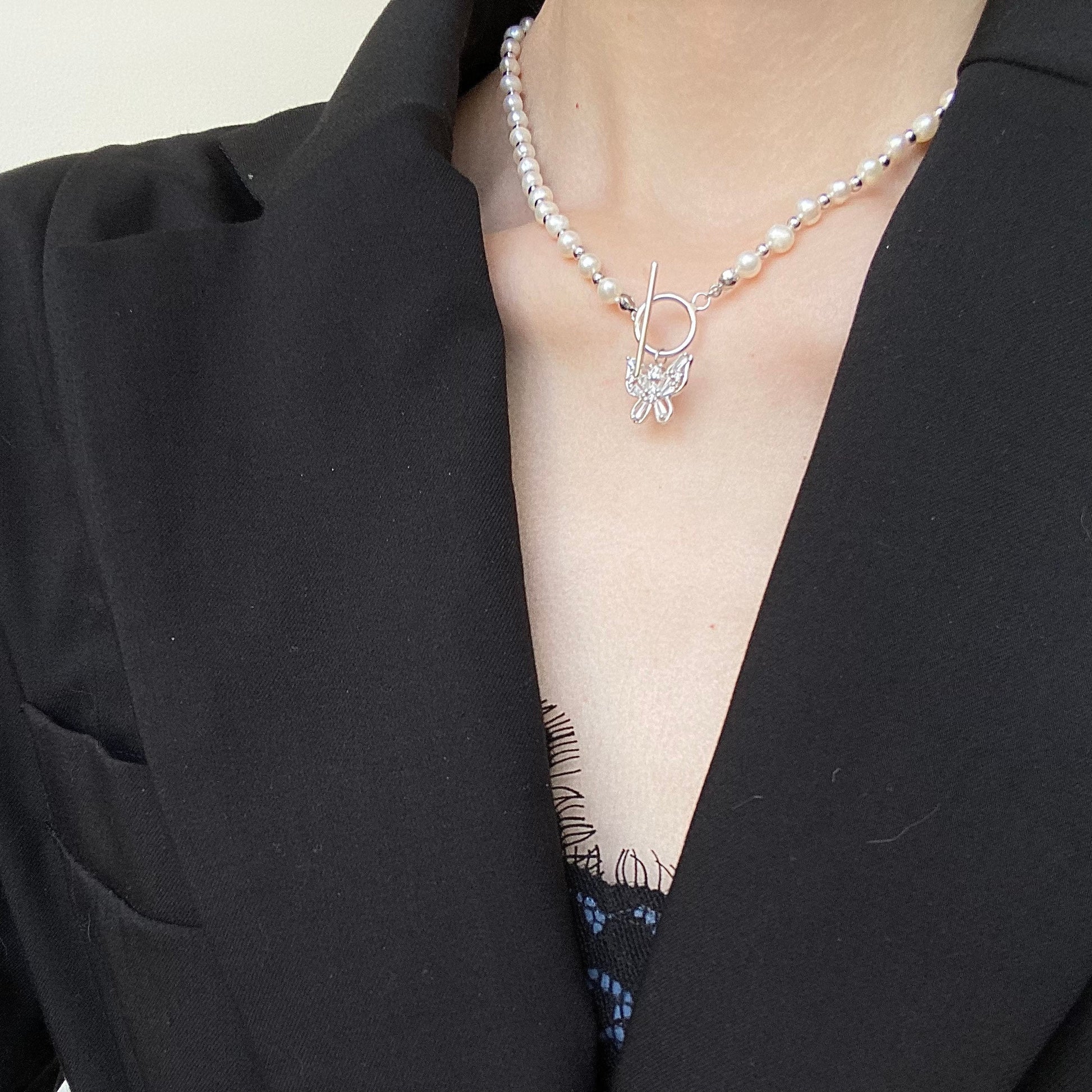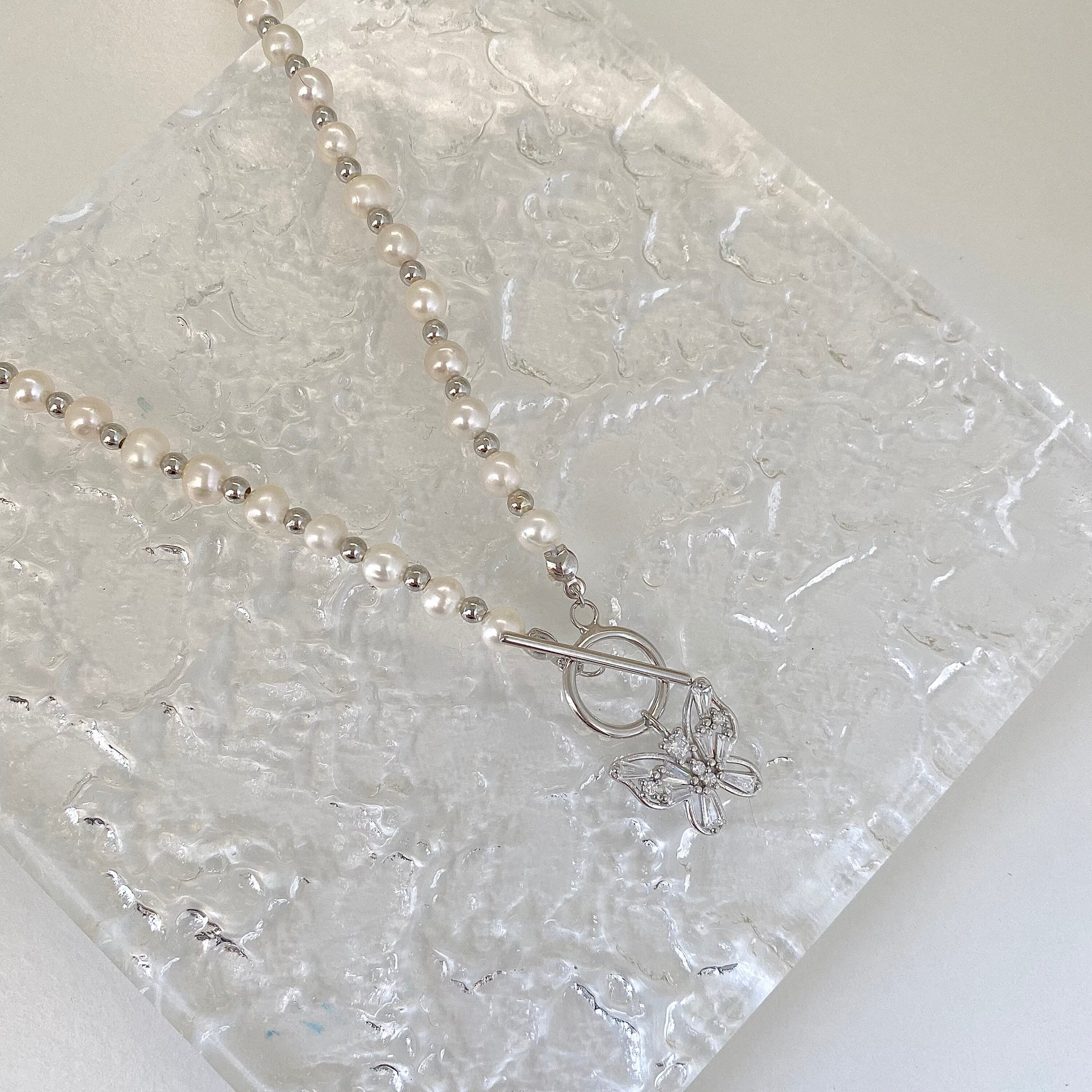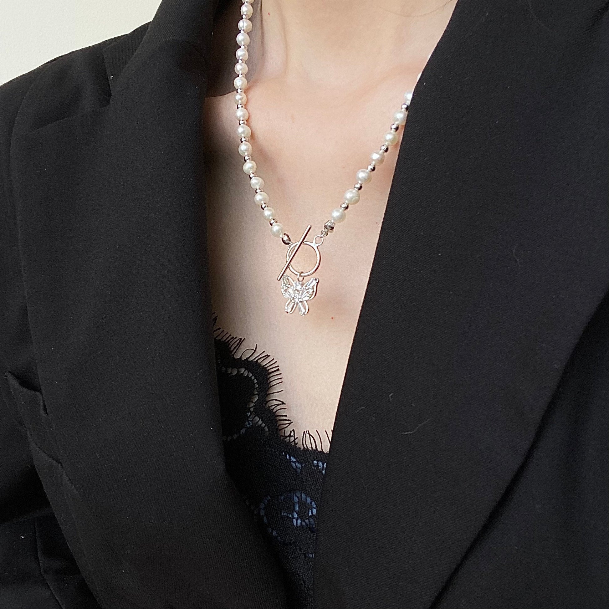 The necklace fastens with an OT clasp made of pure S925 silver, ensuring a secure and comfortable fit. An enchanting silver butterfly charm dangles from the O part of the clasp, adding a whimsical touch to this exquisite piece.