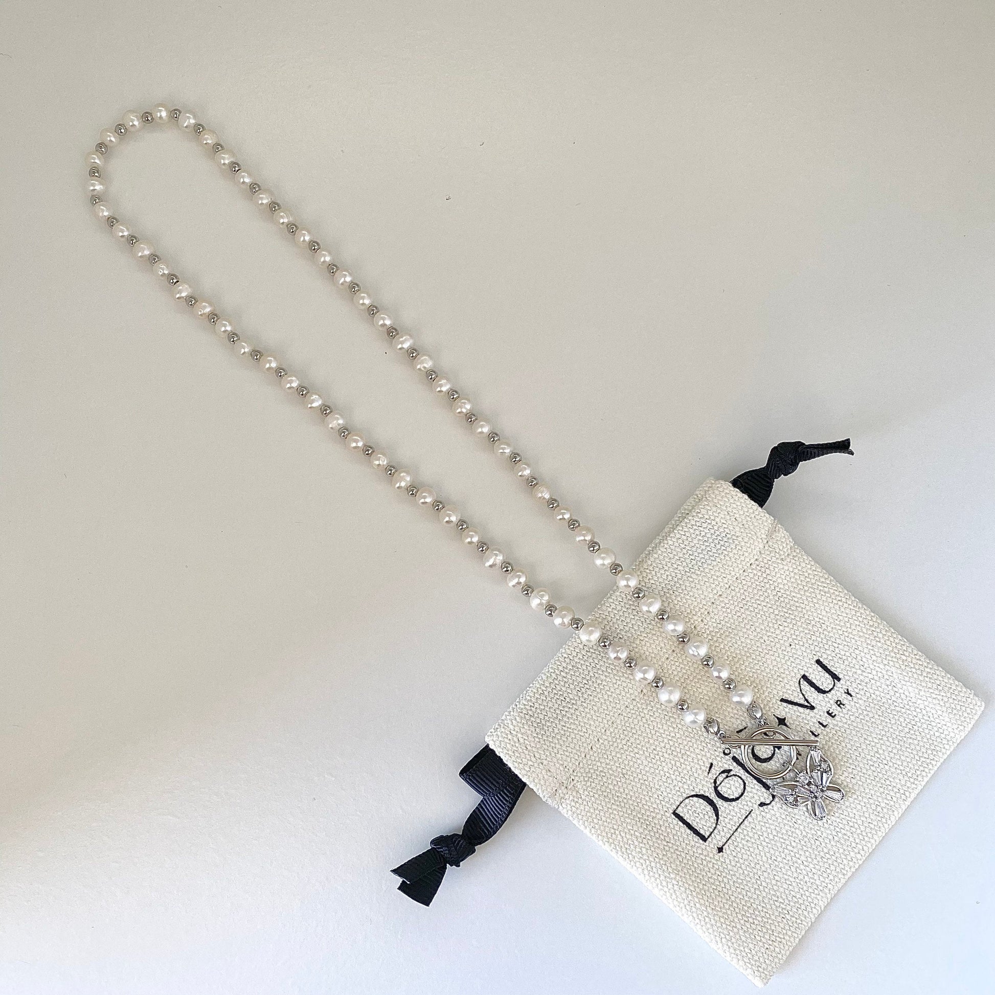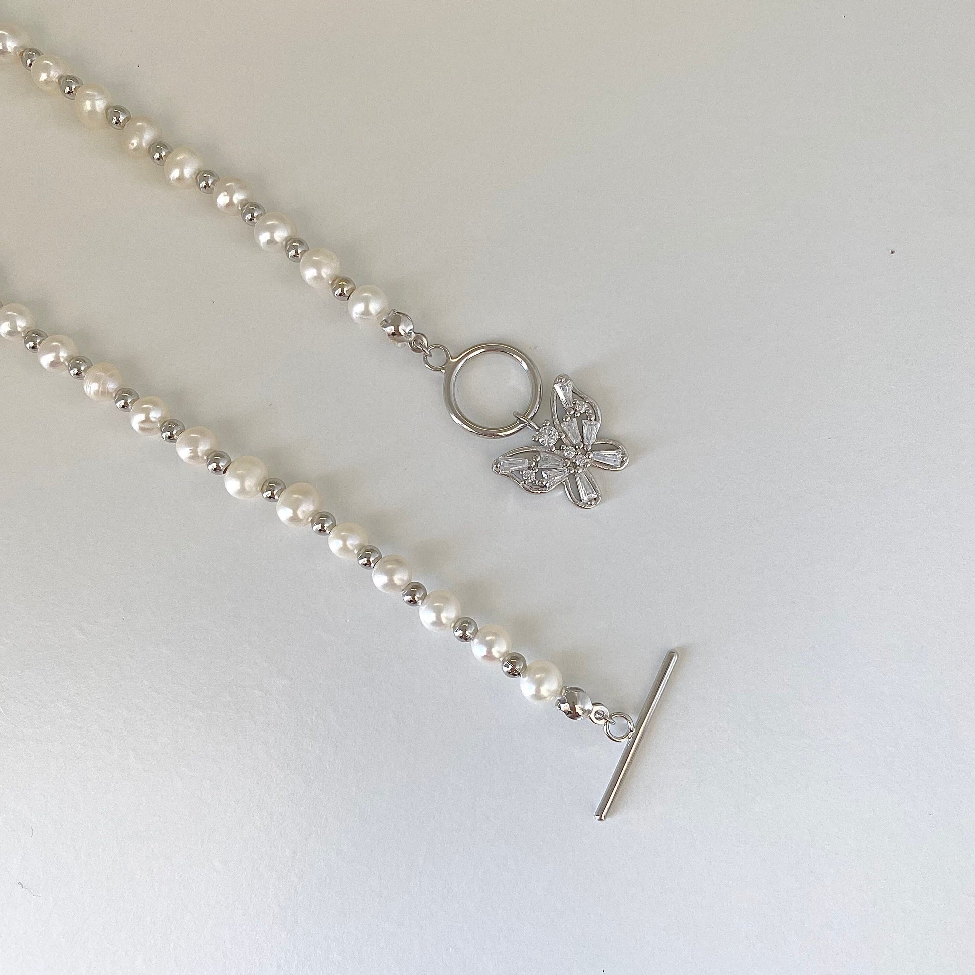 Introducing the Elegant Pearl Cascade S925 Silver Butterfly Necklace, an embodiment of grace and sophistication from our Deja vu Jewellery collection. This necklace features a harmonious blend of natural pearls and small silver beads strung together in an elegant cascade. Each pair of pearls is interspersed with a pure silver bead, adding a touch of sparkle to the necklace's organic beauty.