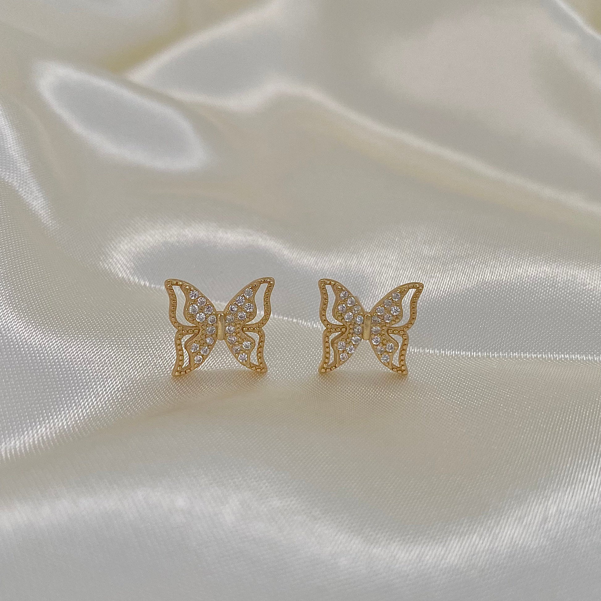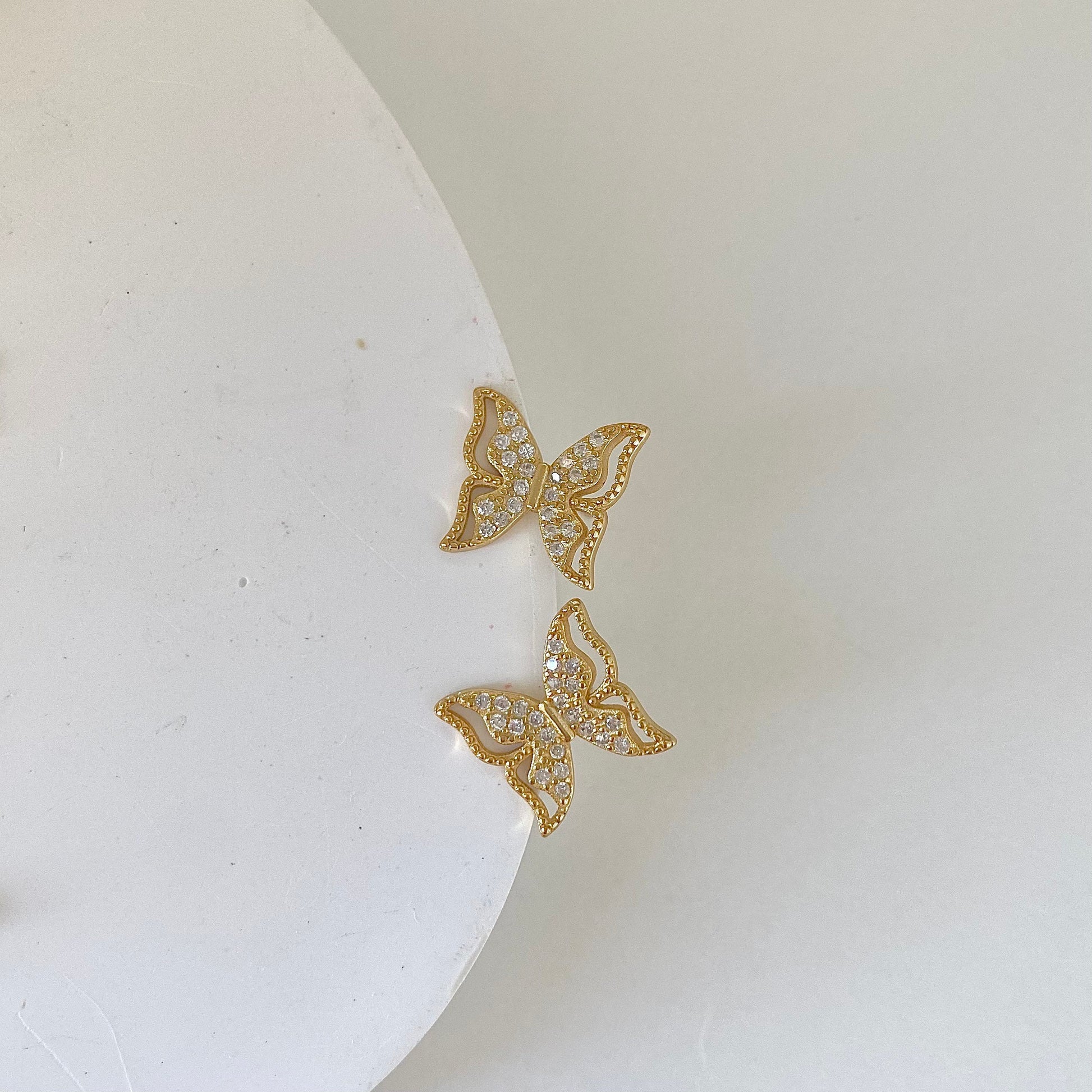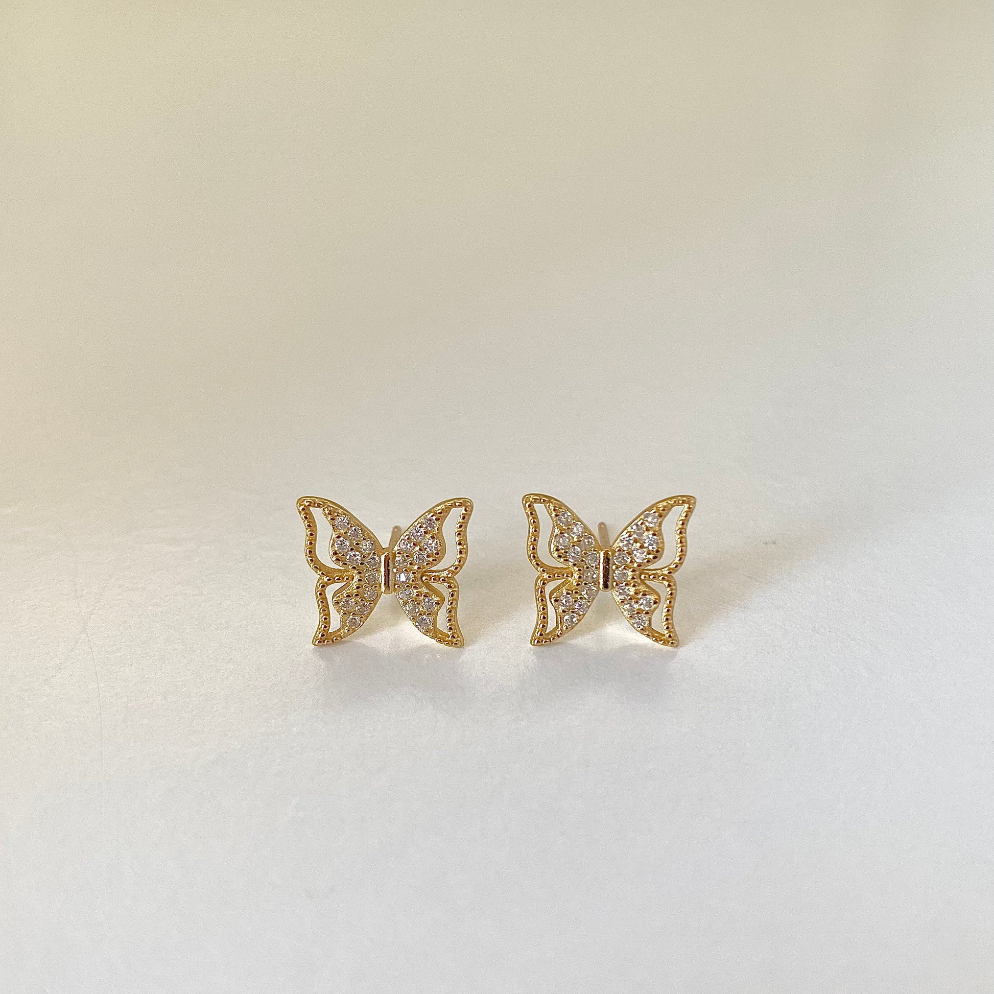 Each stud is designed to resemble a butterfly mid-flight, its wings beautifully spread and adorned with dazzling white zirconia stones. These stones catch the light brilliantly, adding an extra touch of sparkle to your look.