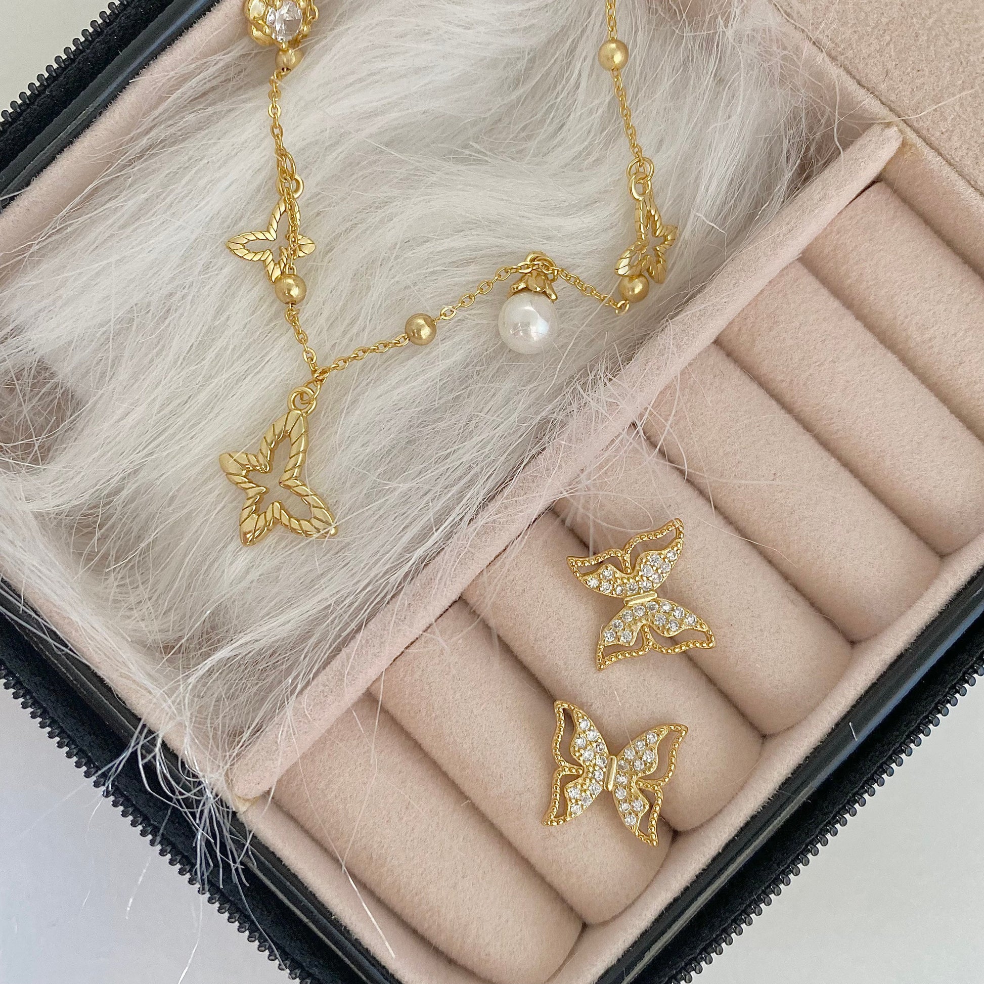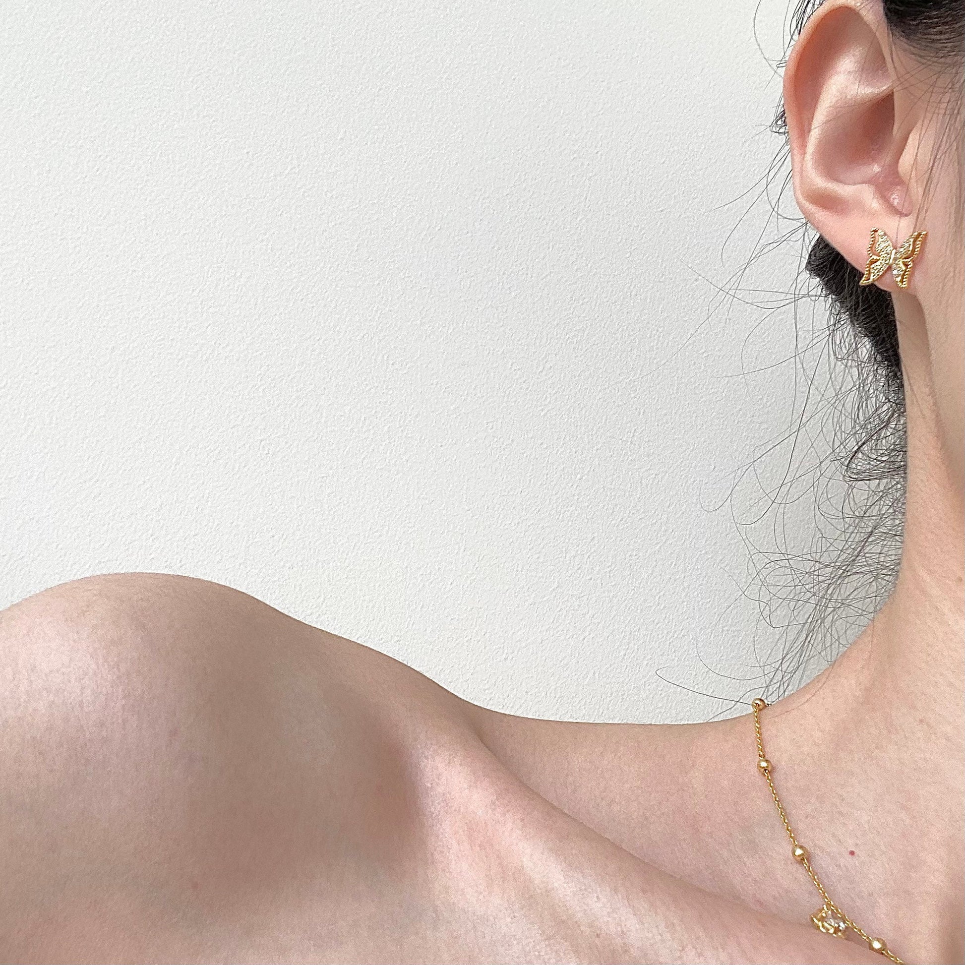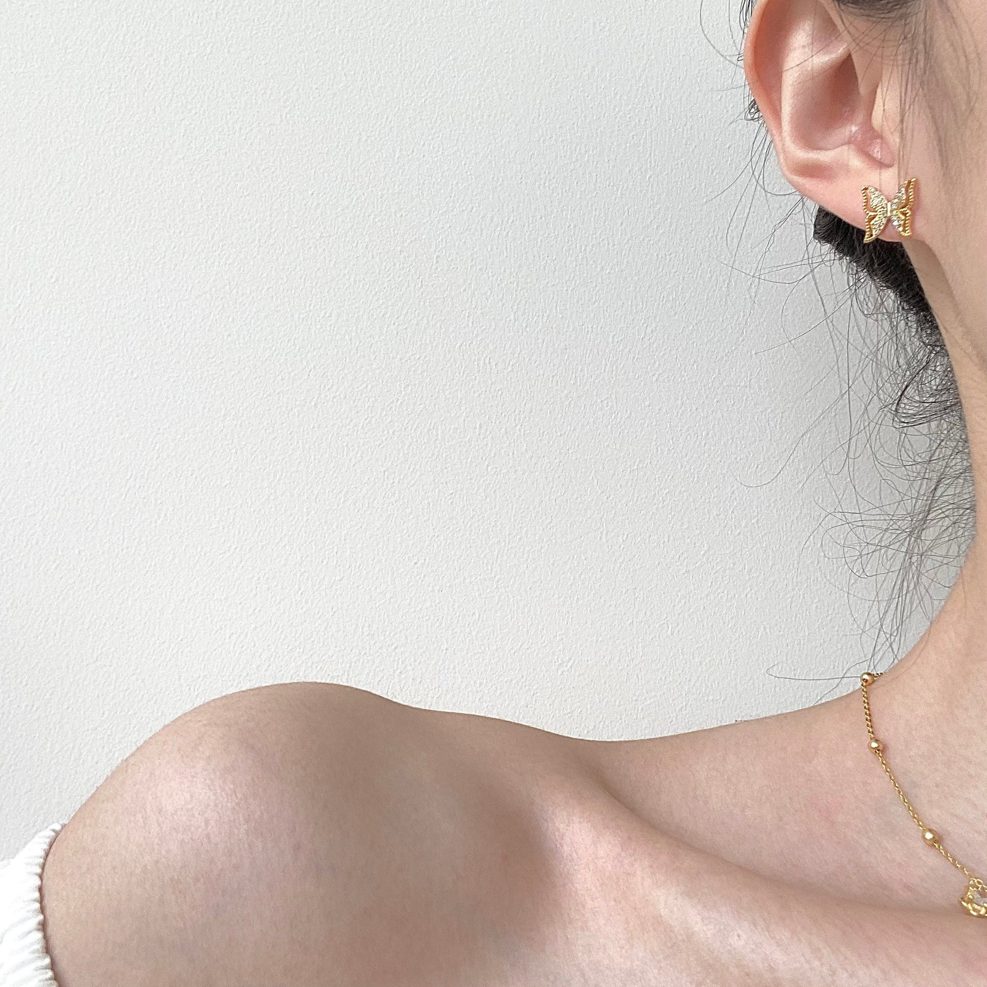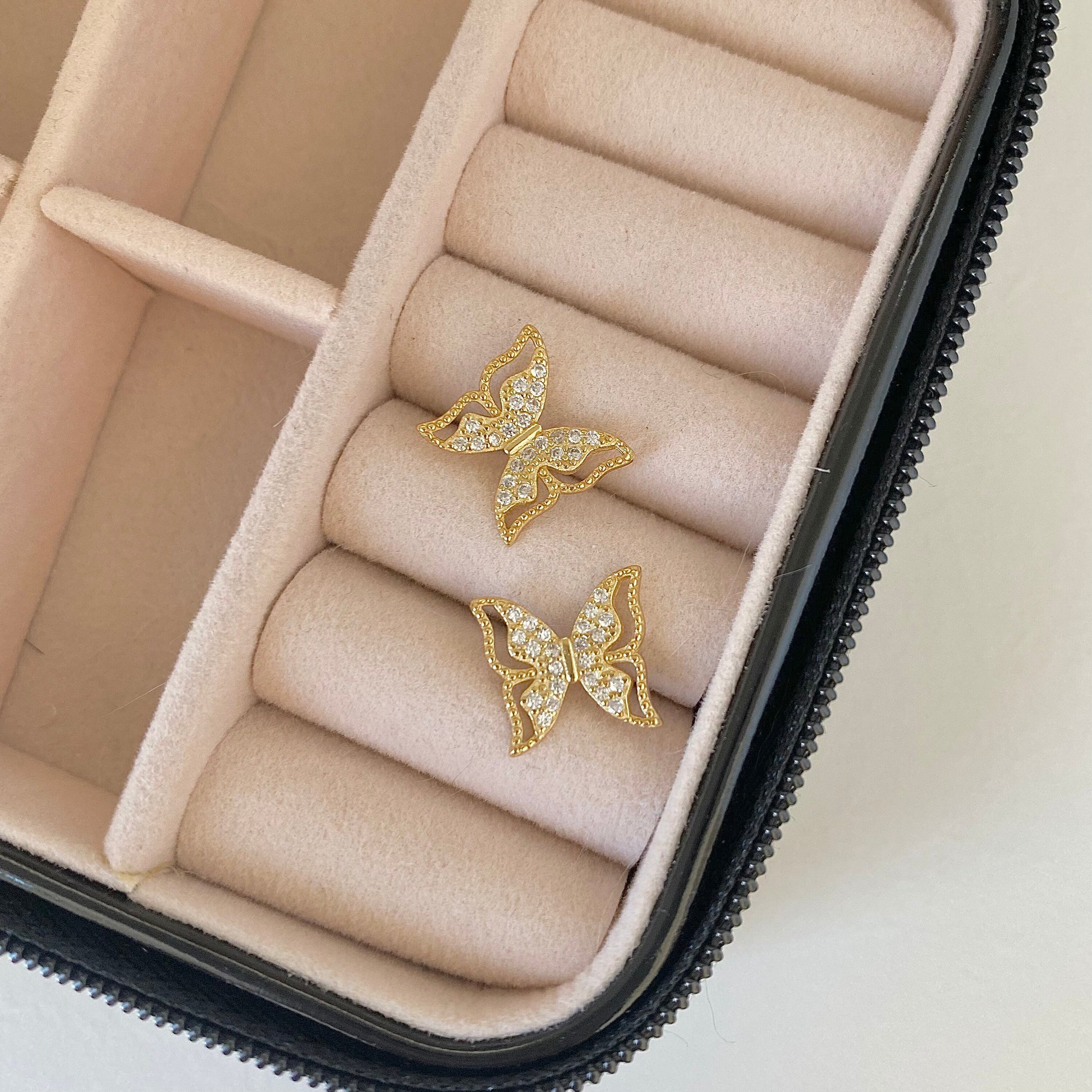 Each stud is designed to resemble a butterfly mid-flight, its wings beautifully spread and adorned with dazzling white zirconia stones. These stones catch the light brilliantly, adding an extra touch of sparkle to your look.