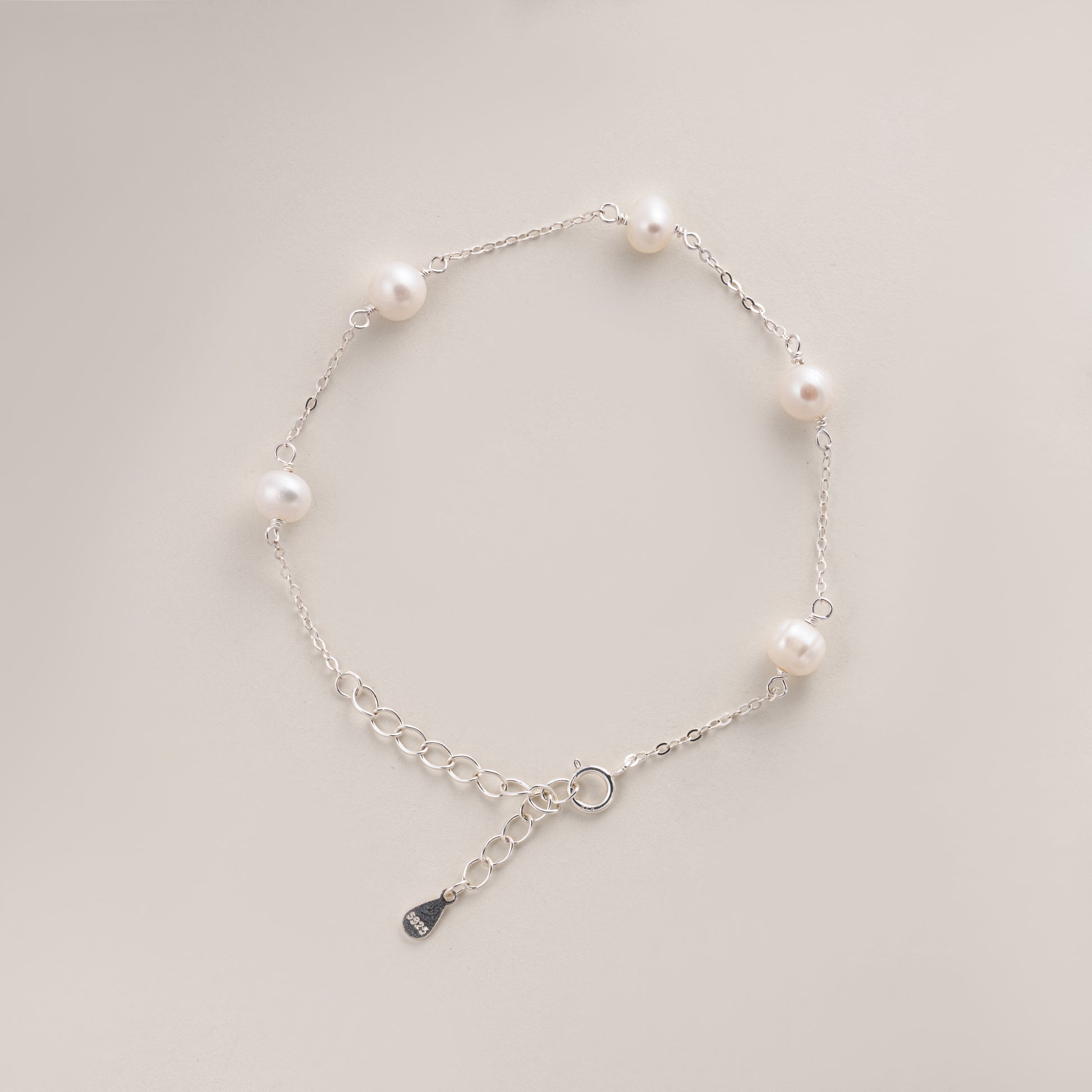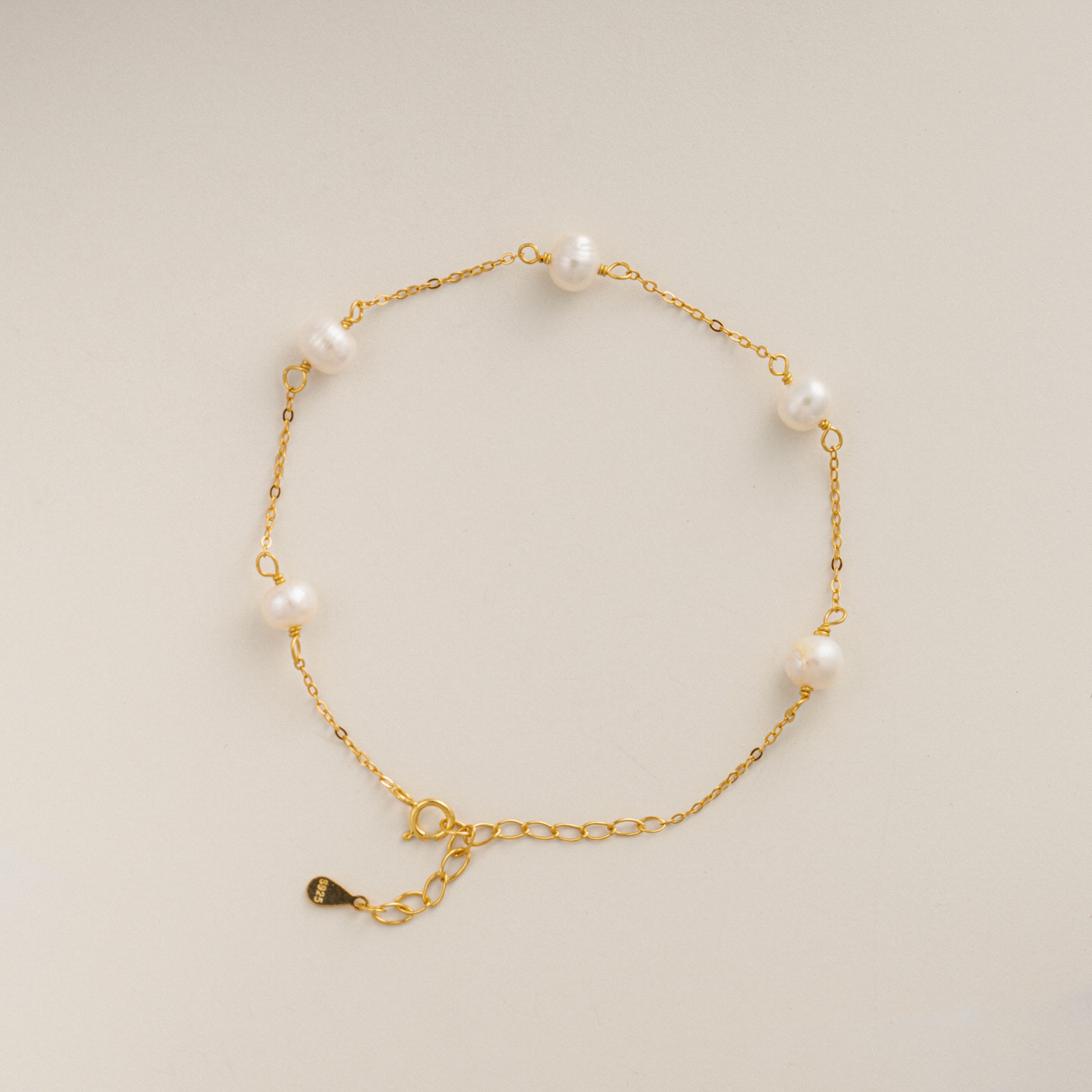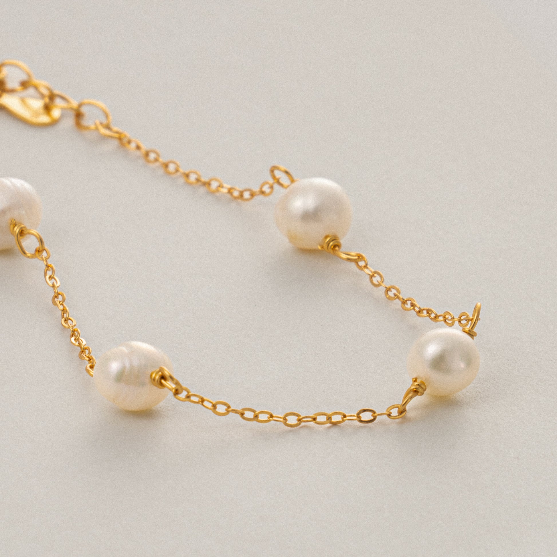 Introducing our Golden Freshwater Pearl Bracelet, a piece that strikes the perfect balance between the timeless elegance of a pearl bracelet and the understated charm of a dainty gold bracelet. This sample bracelet is meticulously crafted from 925 sterling silver and bathed in a radiant layer of 18k gold, manifesting as a stunning gold bracelet. It features five evenly spaced natural freshwater pearls, tastefully positioned along the modern gold chain, which add a touch of classic sophistication.