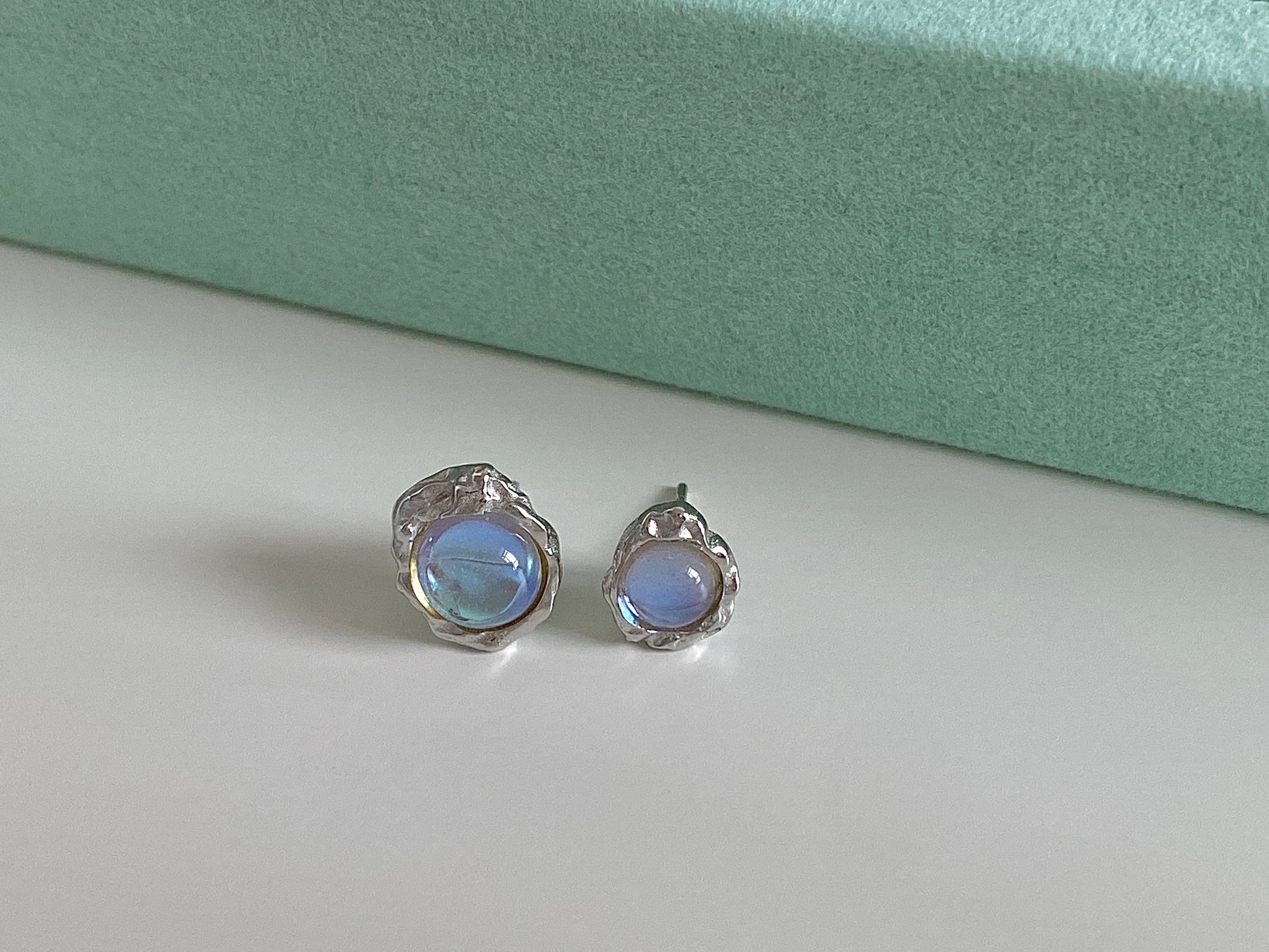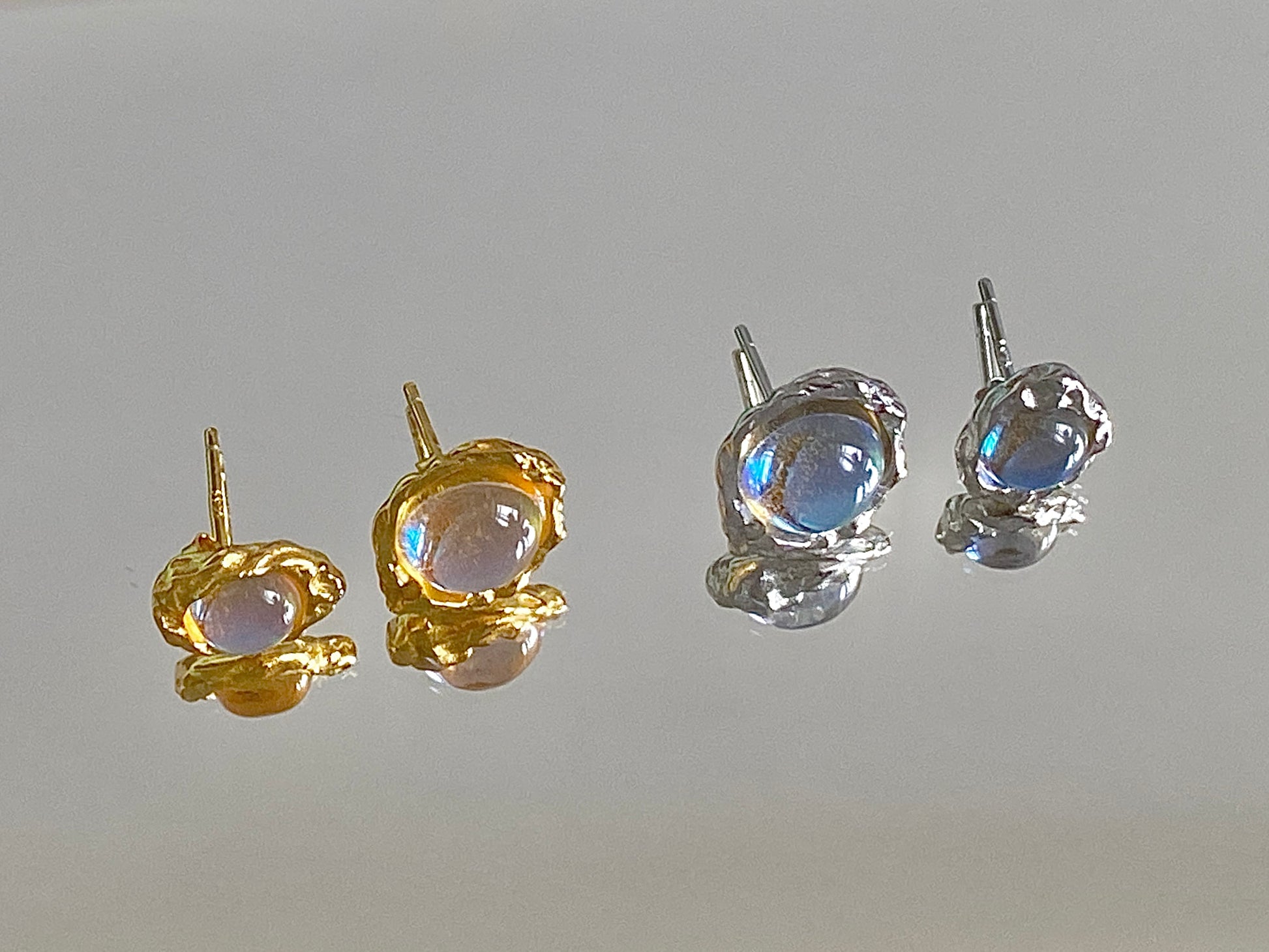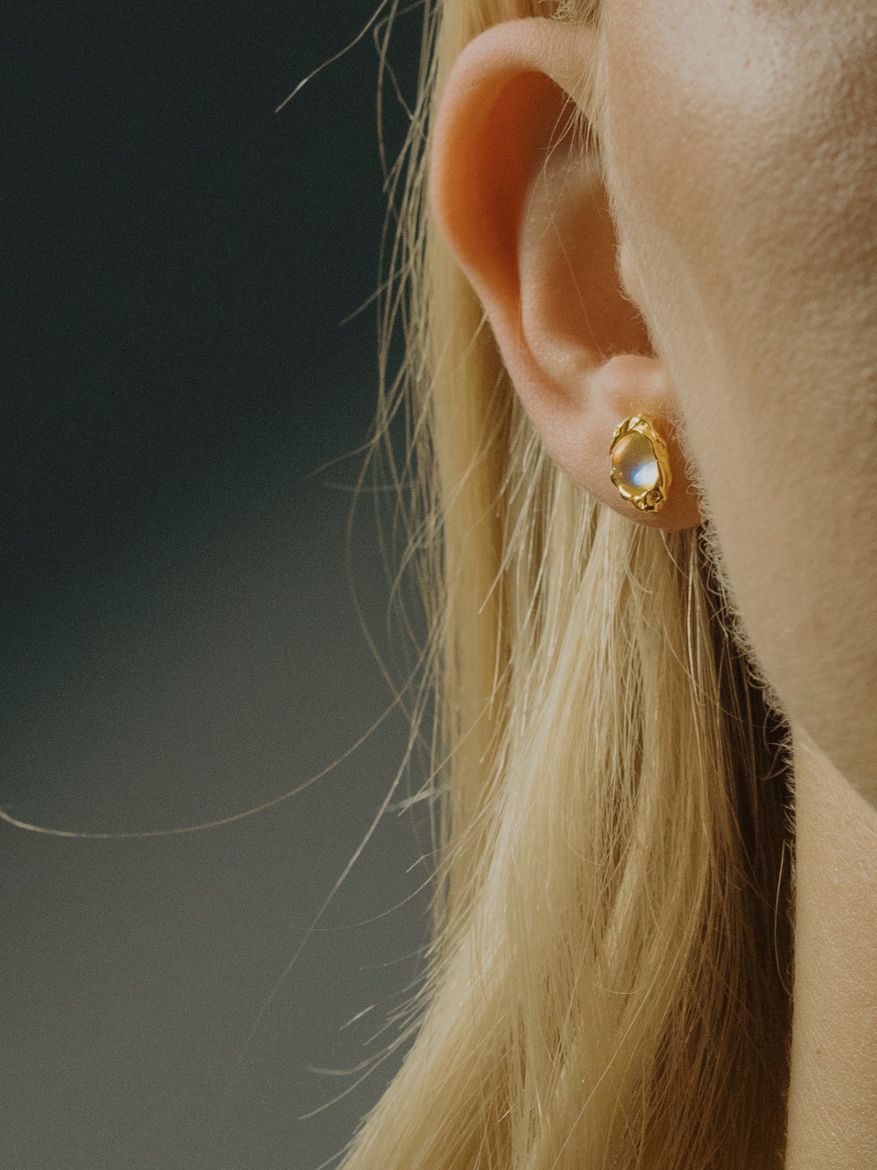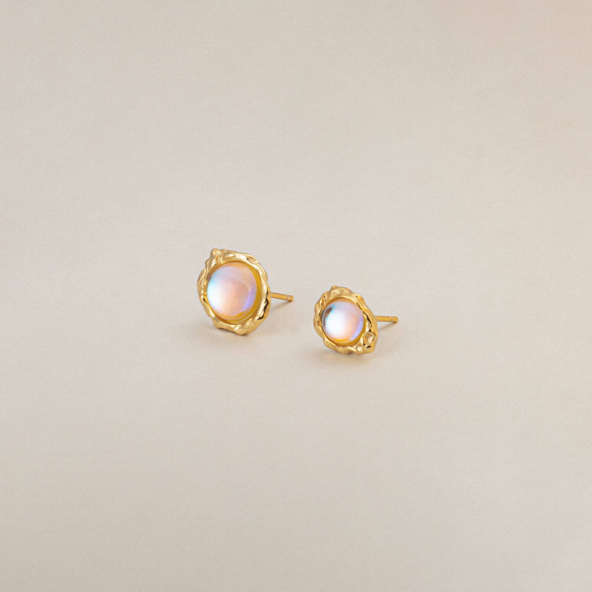 Each earring showcases an irregular lava-like form that partially envelopes a round moonstone, reflecting an interplay of earthly strength and celestial elegance. These dainty earrings adopt an asymmetrical design, featuring 6mm and 8mm diameter moonstones on each earring respectively, offering a minimalist earrings style with a unique twist to a classic piece.