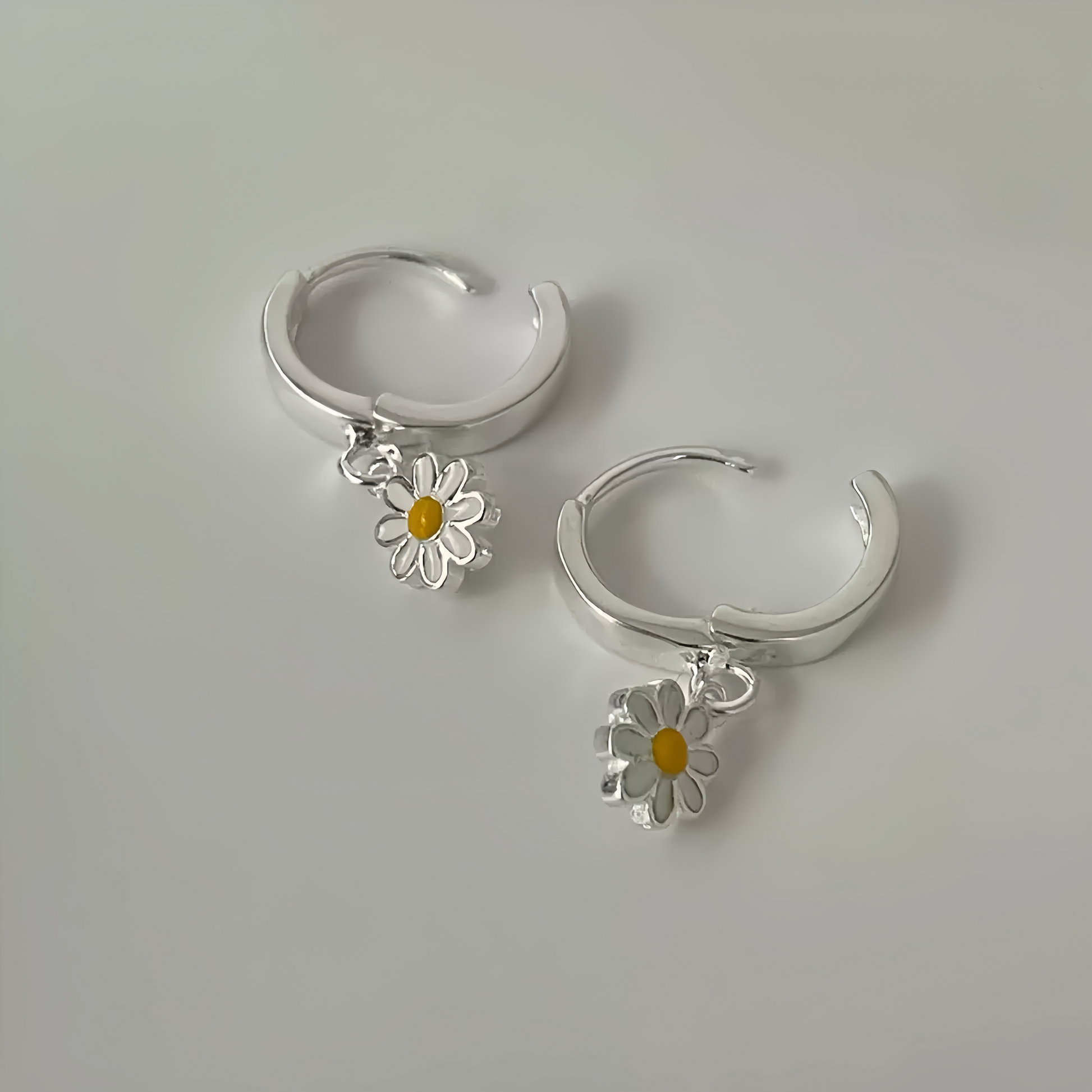 Crafted in 925 silver for sensitive ears, the lightweight floral drop adds a soft pop of white and sunshine-yellow that pairs with everything—think tees, slip dresses, office knits—while the polished hoops stack neatly with other silver hoop earrings or a simple stud. If you’ve been searching for tiny flower hoop earrings that feel delicate but never fussy, these sterling silver daisy hoop earrings deliver durability, comfort, and that quietly cheerful glow; they also make a sweet gift for her (birthdays, bridesmaids, spring and summer) and style perfectly with our matching daisy necklace and bracelet for a cohesive floral set.