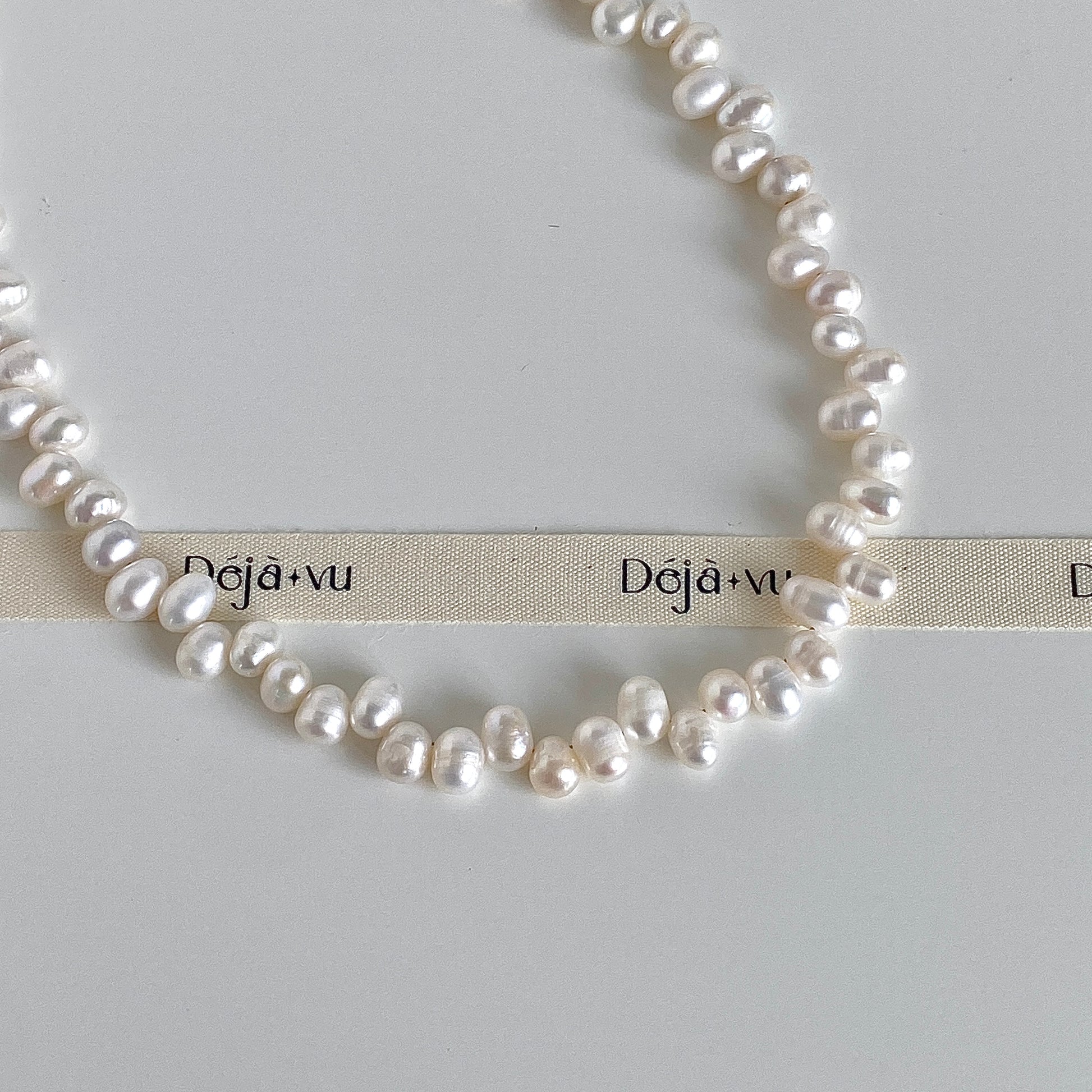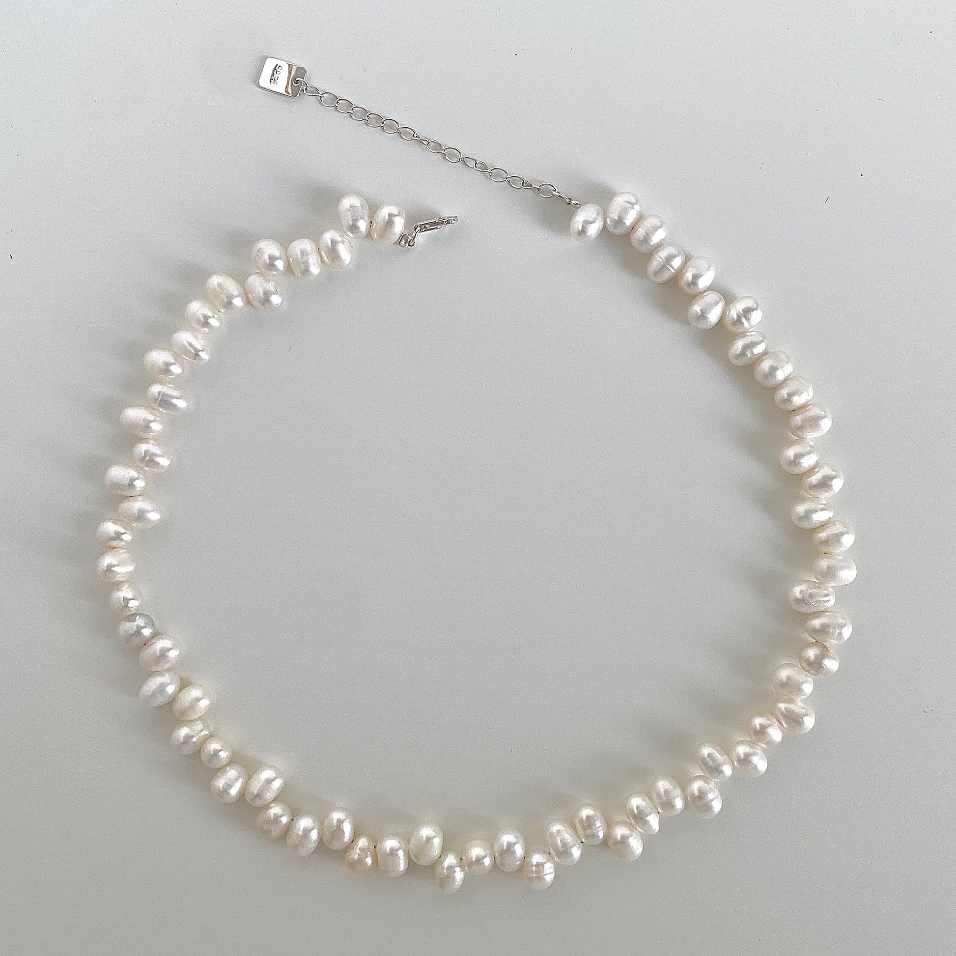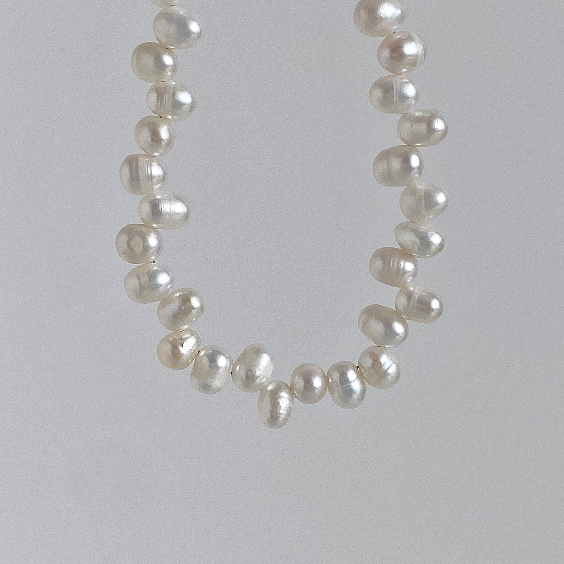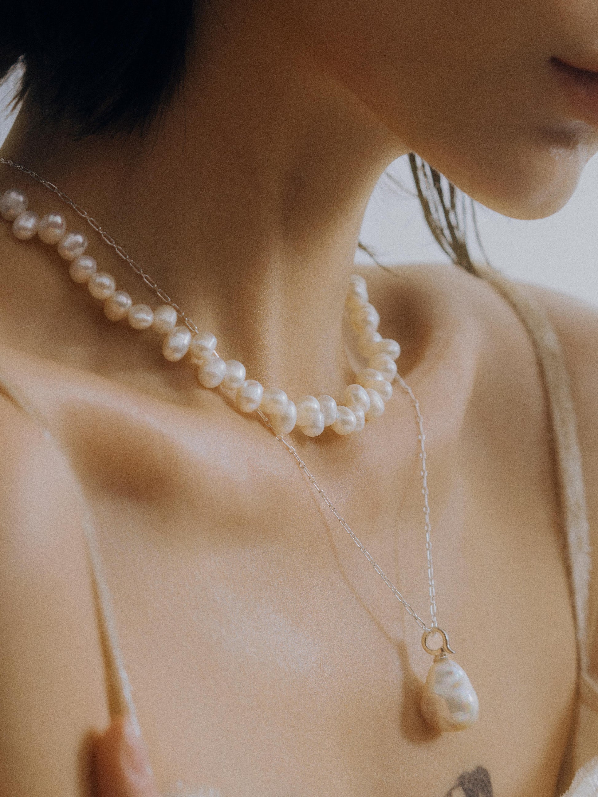 Drawing inspiration from blossoms in their prime, the Petal Perfection choker necklace is more than just a piece of jewelry; it's a tale of nature's transient beauty. Each pearl, with its distinct form, narrates a story of individual petals shaped by nature's artistry. As they intermingle with the silver's sheen, they conjure visions of a garland of dew-kissed petals resting on one's collarbone.