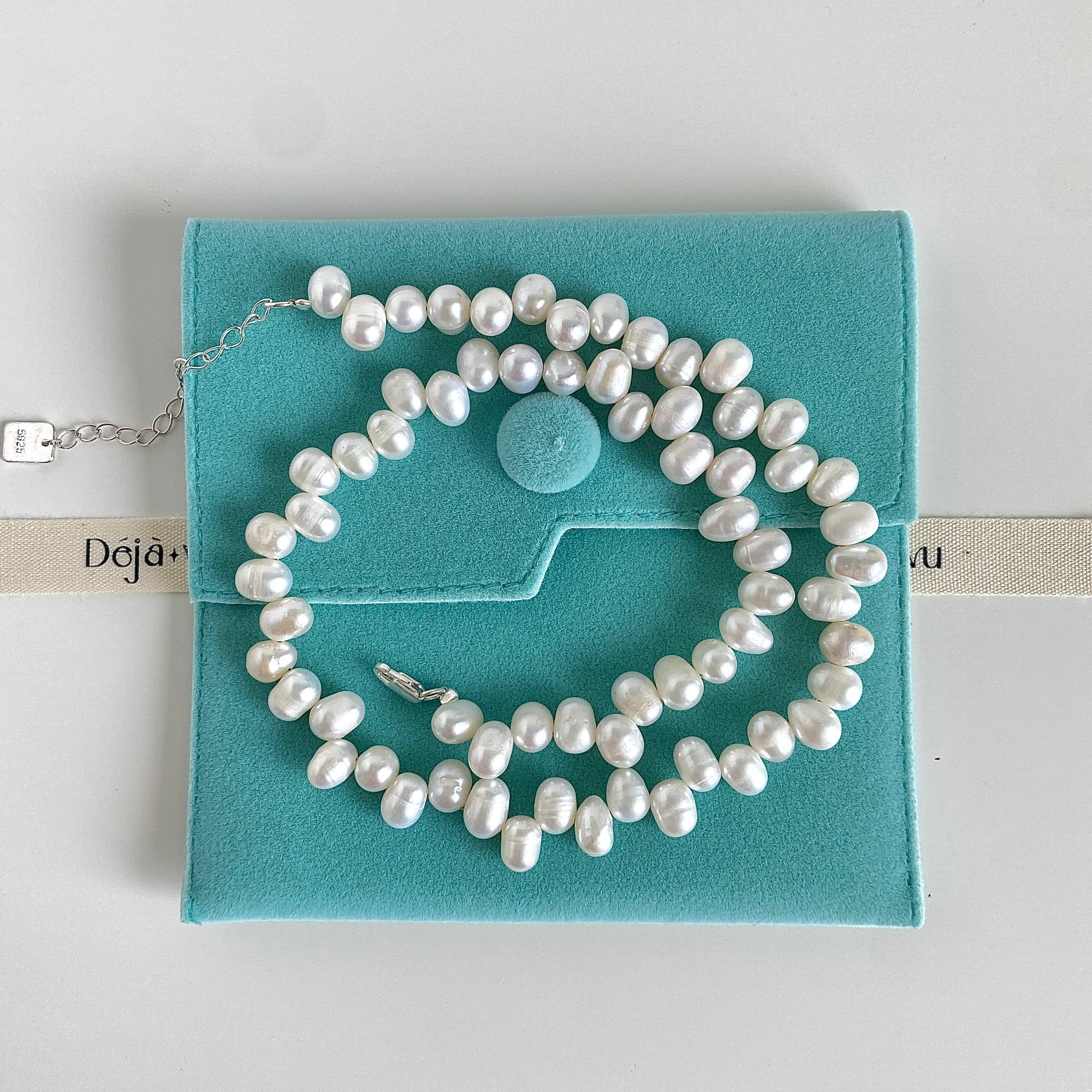 Delicately strung on a lustrous 925 Sterling Silver chain, the necklace takes pride in its series of elliptical natural freshwater pearls. Each pearl, with dimensions of approximately 6mm by 7mm, is reminiscent of the gentle curve of flower petals, thereby coining its poetic name.